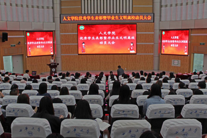5月29日,人文学院在四教报告厅举行优秀学生表彰大会暨毕业生文明离校动员大会。学院全体领导、三办主任、各系主任及辅导员出席本次大会,各年级学生代表参加活动。