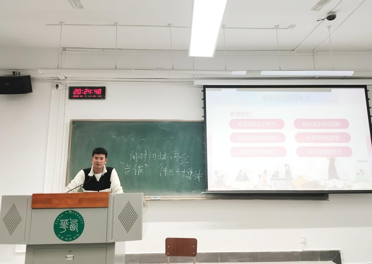 班会从学生身份认知转变展开。任焦阳从五个方面来讲述如何适应大学生活,让同学们从个人成长、人与人之间的交际、生活状态的改变等方面认识大学生活。同时,他结合个人经验,鼓励同学们在大学本科期间要不断认识自己,塑造自己,发展自己;告知同学们学会独立自主,做好人生选择;提出要明晰校规校纪、转变学习方式、制定明确目标、学会沟通交际、学会包容等建议措施。