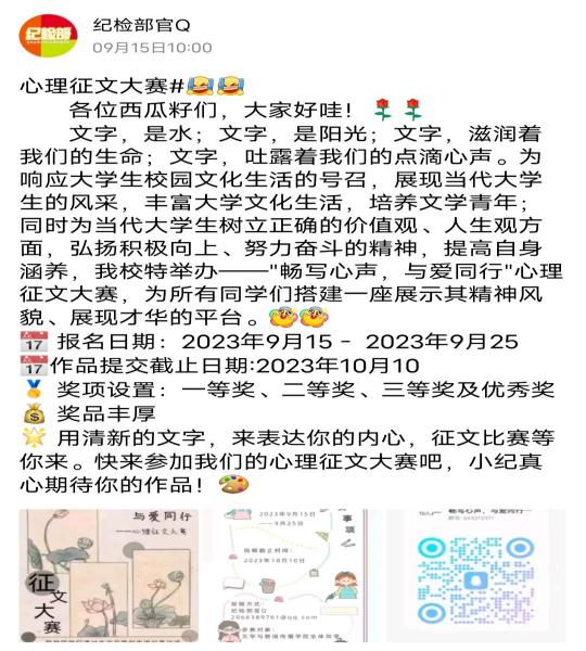 本次大赛是面向全体西华学子的一场心理征文比赛,自9月15日报名开始后,就得到了同学们的积极响应,来自不同年级、专业的同学纷纷投稿,体现了同学们对心理健康的高度重视。