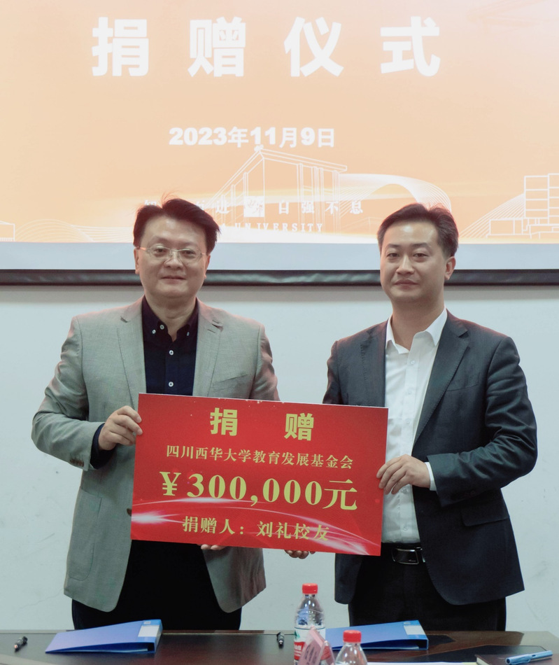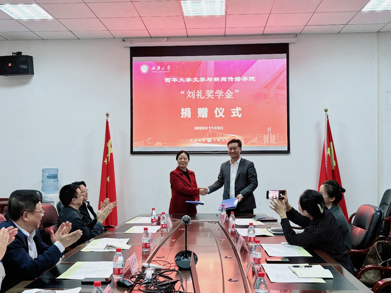 在捐赠签约仪式上,徐攀隆重介绍了与会领导和嘉宾。校友刘礼与王丽娟处长现场进行签约并合影留念。刘礼正式向文新学院捐赠奖学金三十万元,潘殊闲院长代表学院接受捐赠。西华大学副校长刘小兵为刘礼颁发捐赠证书。