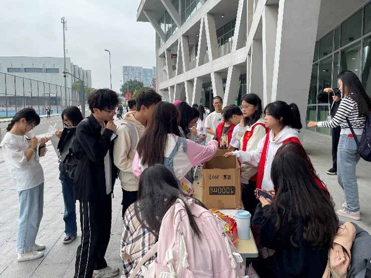 志愿者们在宜宾校区二食堂门口布置好了现场,提前准备了便利贴及小奖品,写下祝愿及问题即可获得小奖品,吸引了大量的同学来参与。