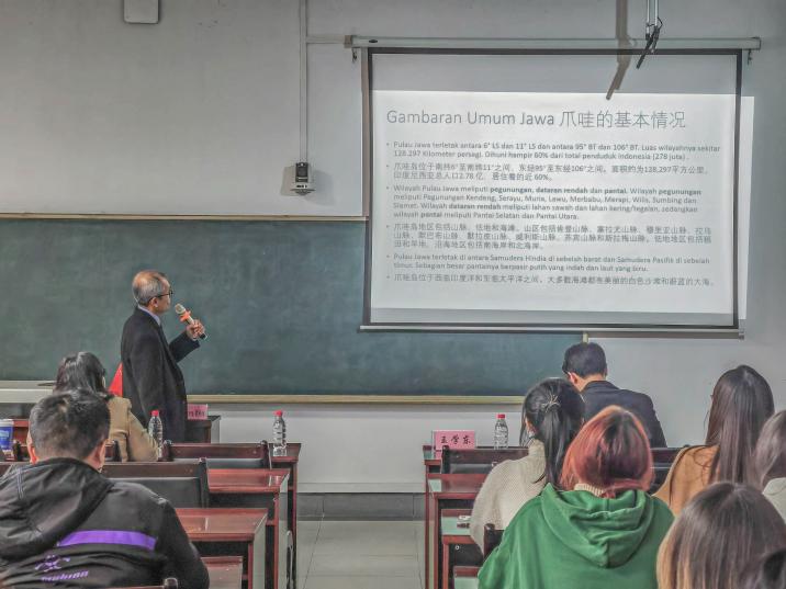 讲座上,华文忠教授首先从地理位置、气候、种族等角度介绍了爪哇的基本情况,随后从起源、传播、特点等方面补充了爪哇的文化特色,向我校师生展示了爪哇文化的深厚底蕴和深远影响。同时,华文忠教授还从历史角度介绍了梭罗华人,高度肯定华人社团在爪哇文化中的作用与影响,并表示爪哇文化与中华文化密不可分。最后,华文忠教授用图片全方位多角度地展示爪哇的历史、地理、艺术等文化内容。在场师生对爪哇文化表现出浓厚兴趣。