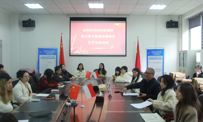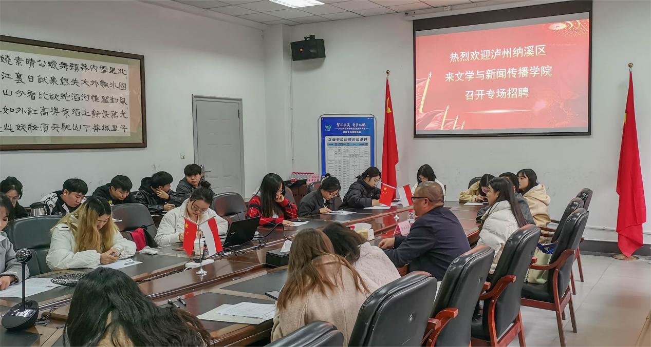 纳溪区人力资源服务中心负责人唐洪在现场以 “在泸州,遇见新机遇、迎新发展”为主题,为参加招聘会的同学介绍了泸州市经济社会发展状况,详细讲解了泸州市大学生人才引进的政策,鼓励同学们在新时代赴泸州建功立业。