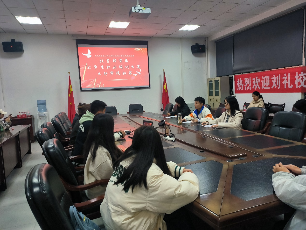 11月16日,文新学院在郫都校区和宜宾校区同步组织开展四川省首届大学生职业规划大赛文新学院初赛。学院一百三十余名参赛选手参加,学院团委书记任焦阳、学院宜宾校区团总支书记陈艳、辅导员毛雪花、袁梦、姜超超、谢安宁、团委副书记肖明春担任评委。