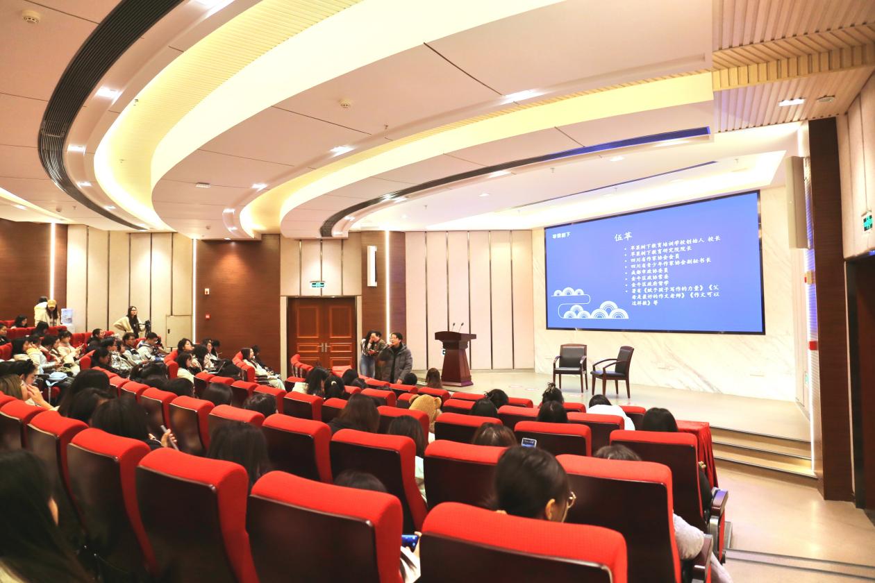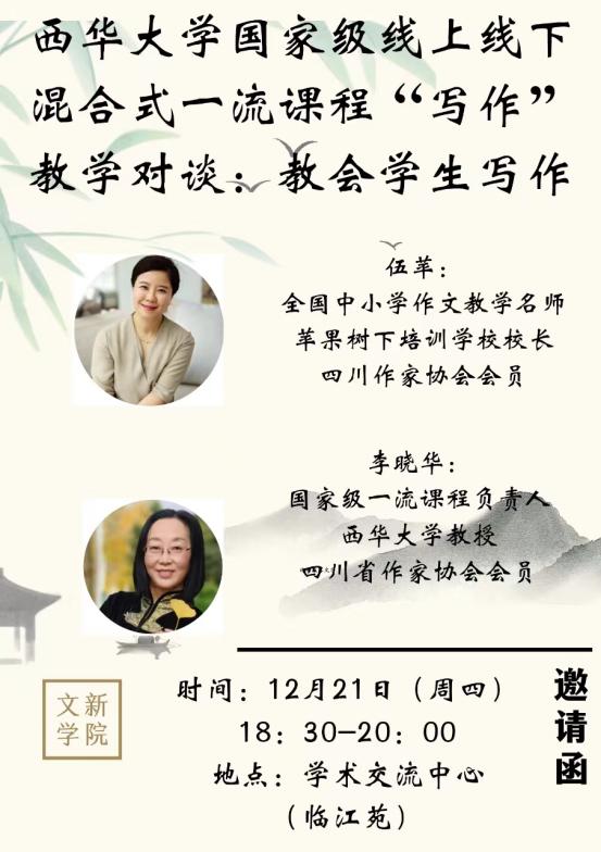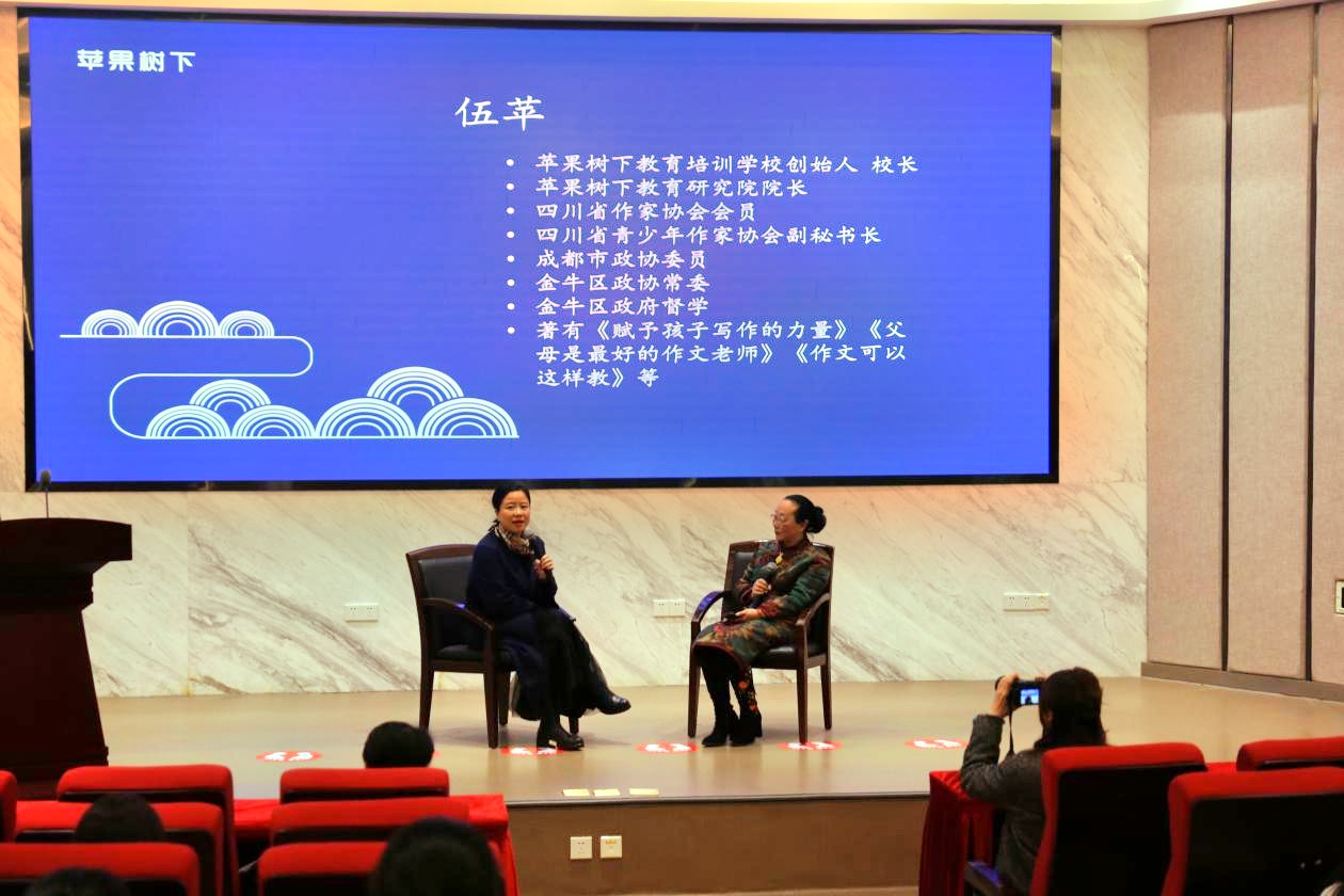 晚上七点,西华大学教授李晓华和苹果树下创始人伍萍校长在西华大学学术交流中心进行了“梦幻联动”——对谈“如何教会学生写作”。