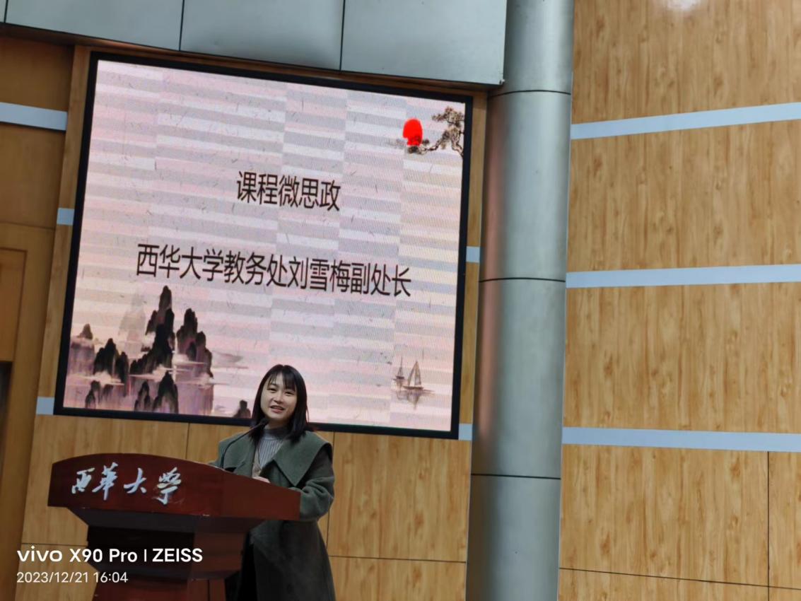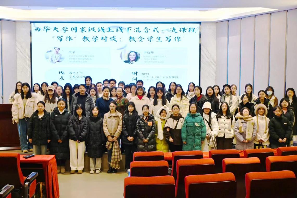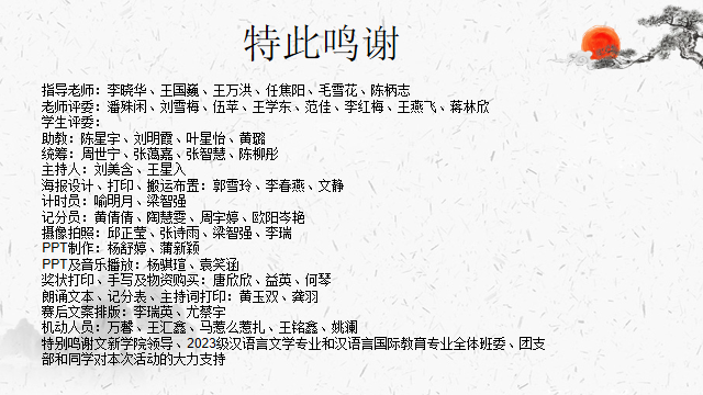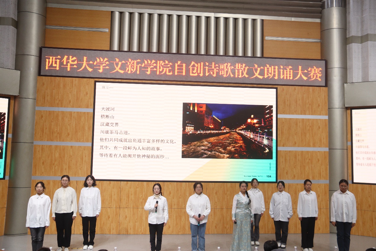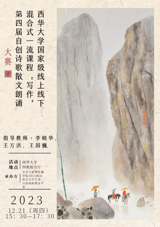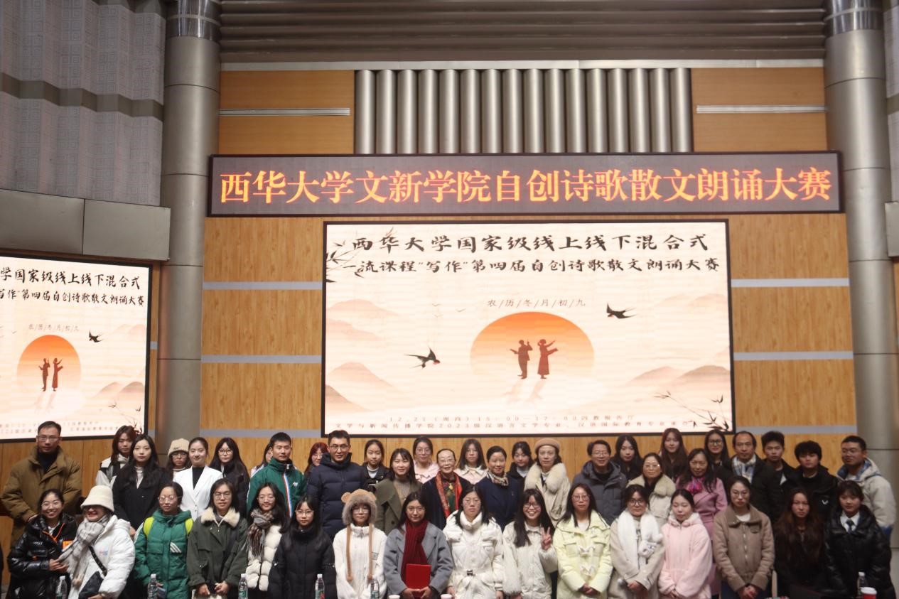 2023年12月21日下午6点,西华大学国家级线上线下混合式一流课程“写作”第四届自创诗歌散文朗诵大赛在四教报告厅完满落幕,西华大学教务处副处长刘雪梅老师、苹果树下培训学校校长伍苹老师、西华大学人事处教师工作部李红梅博士,文新学院院长潘殊闲教授、副书记徐攀老师、副院长王学东教授、副院长范佳博士、中文系主任王燕飞博士、中文系副主任蒋林欣博士等担任比赛评委。文新学院2023级辅导员陈柄志老师、任焦阳老师、毛雪花老师和2023级写作教师李晓华教授、王万洪教授、王国巍老师全程指导,现当代文学专业研一学生叶星怡、陈星羽、刘明霞、黄璐作为“写作”课程助教也全程联动。汉文一班何蓉、汉文二班陈思霏、汉语国际教育1班陈柳彤担任学生评委。