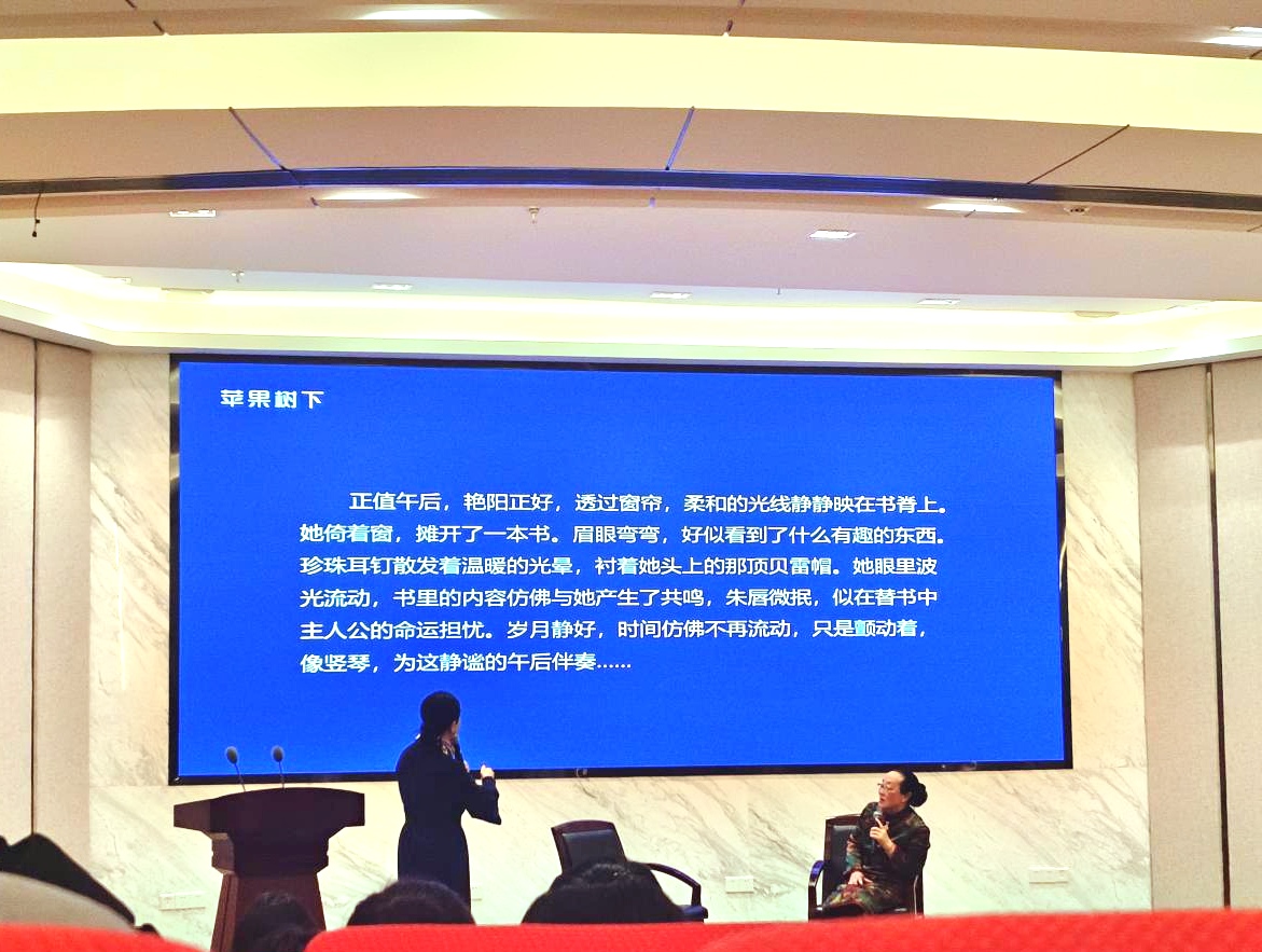 另外,伍苹校长还分享了自己戴着贝雷帽,坐在教室看书,当学生写作的“模特”,让学生用文字来描绘这个场面的有趣经历。大屏幕上,只见一位学生描写到:“正值午后,艳阳正好,透过窗帘,柔和的光线静静映在书脊上。她倚着窗,摊开了一本书。眉眼弯弯,好似看到了什么有趣的东西,珍珠耳钉散发着温暖的光晕,衬着她头上的那顶贝雷帽。她眼里波光流动,书记的内容仿佛与她产生了共鸣,朱唇微抿,似在替书中主人公的命运担忧……”跟随小作者的文字,大家的脑海中似浮现出了相应的画面,纷纷为作者优秀的文笔和细腻的语言鼓掌。