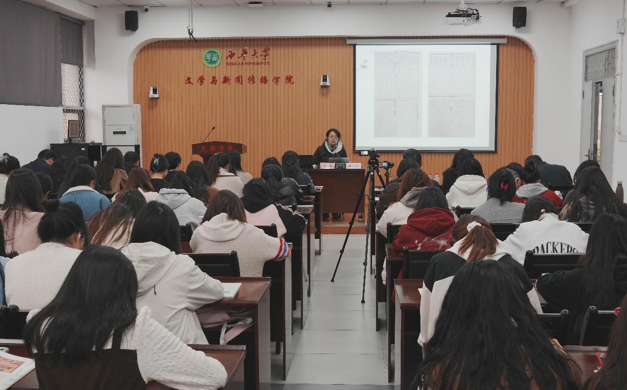 高梧教授以“此夜曲中闻折柳,何人不起故园情”为题来表方志之情,达方志之义。高梧从多维度介绍了历史名人对方志的使用情况,并结合自身经历就方志文化文以载道、志海拾贝、烛照前路、为用而藏四个方面进行解读。她运用大量精美的资料图片以及真实鲜活的实际案例全面系统地讲述了方志收藏的历史地位、社会意义、精彩内涵、重要价值。最后,高梧指出如今数字化图书发达,呼吁学校师生利用数据库传承中华优秀传统文化,增强中华优秀传统文化自信。