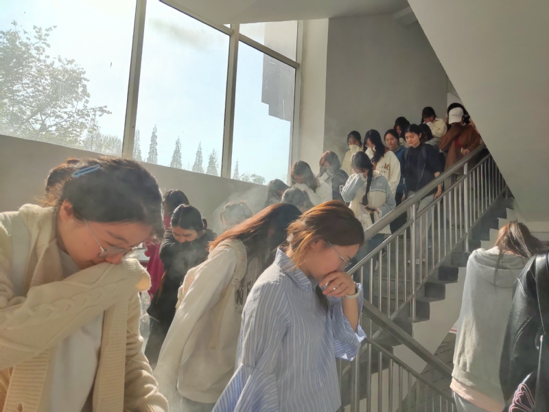 随后,为更好地将所学用于实践、掌握火灾逃生技巧,学院开展火灾疏散逃生演练活动。下午16:30,随着火警警报声的响起,浓烟四起,同学们在老师的指引与疏散下,迅速有序下楼、捂住口鼻、弯腰撤离火灾现场。全部人员撤离完毕后,学生代表运用消防知识正确使用灭火器扑灭火源。演练有效地锻炼了同学们的逃生技能,在实际的安全演练中进行了消防安全教育,提高了同学们的消防意识。