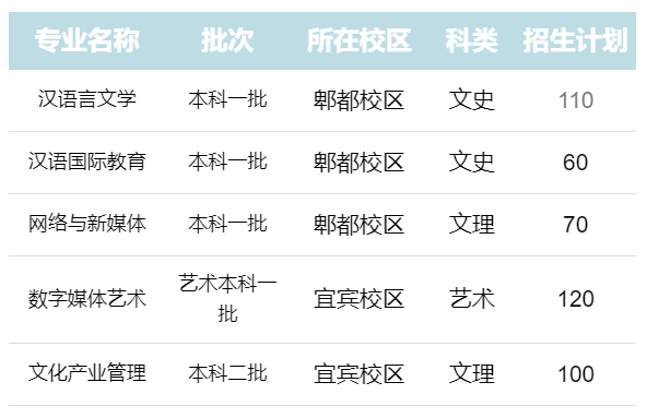 西华大学bw西汉姆联现设有中文系、传媒系、文化产业系3个教学系,有汉语言文学、汉语国际教育、网络与新媒体、数字媒体艺术和文化产业管理5个本科专业,有中国语言文学一级学科硕士学位授权点1个,有学科教学(语文)、新闻与传播2个专业硕士学位授权点。