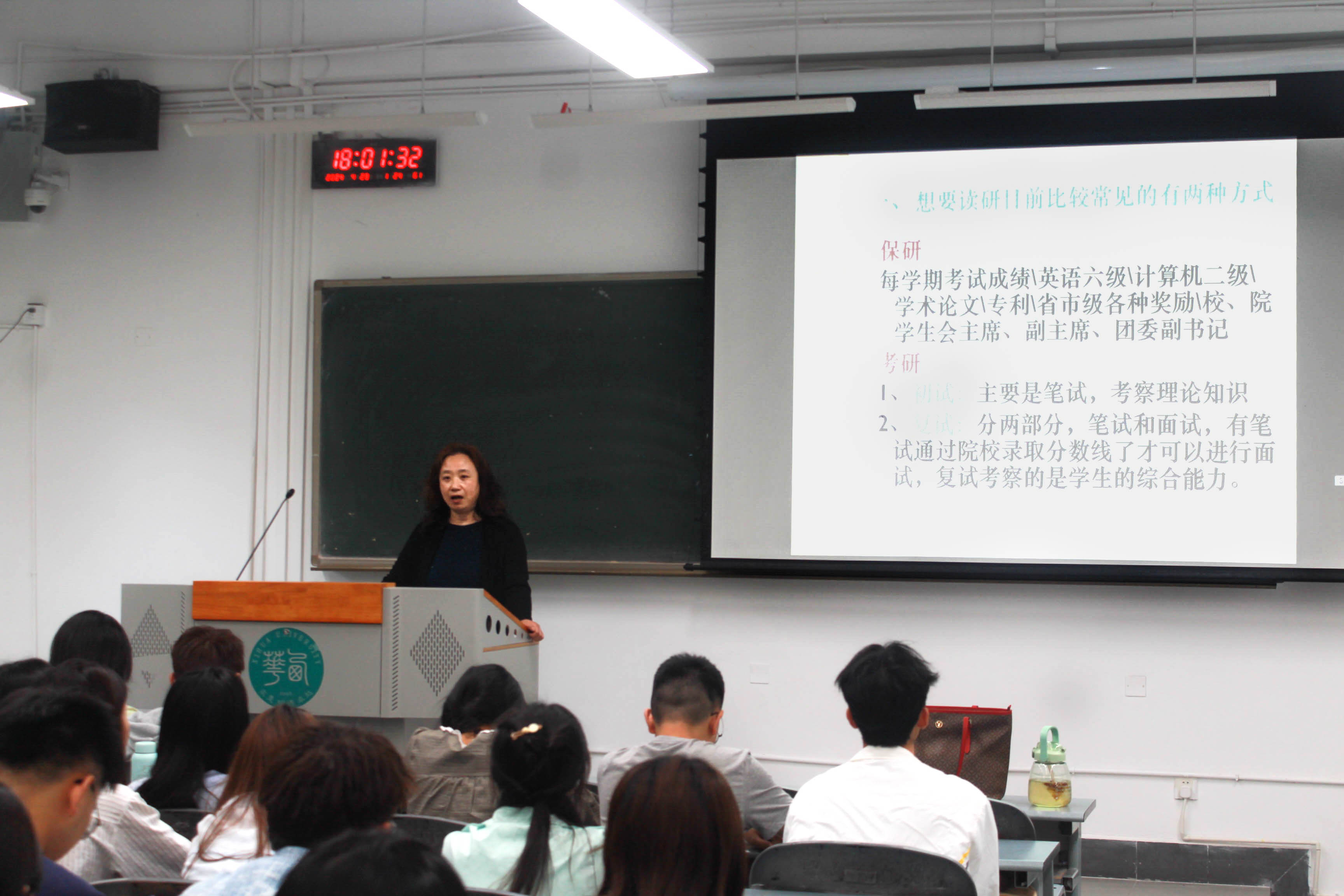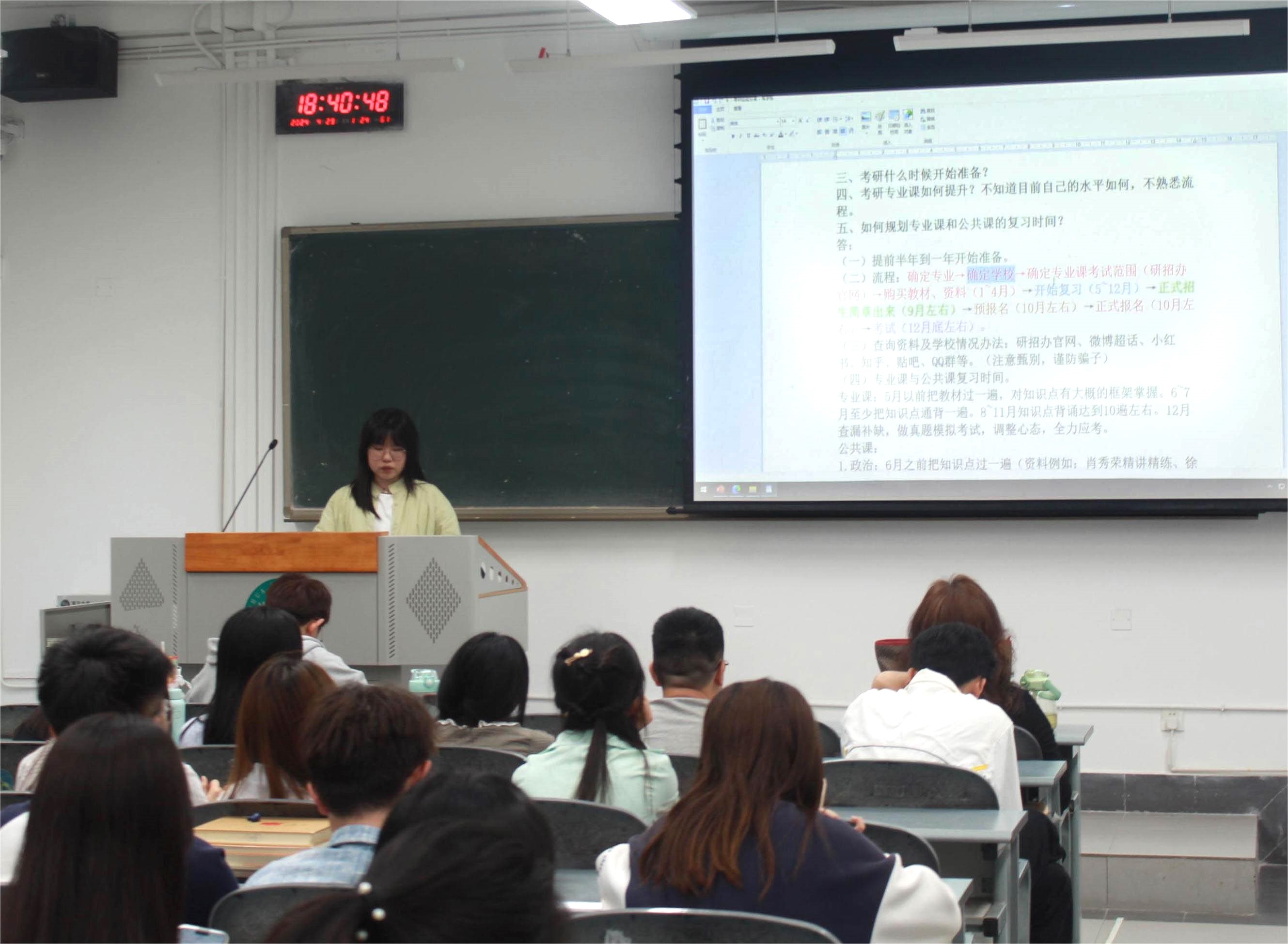 辅导员徐薇向同学们介绍了考研的基本过程,她以2024年全国硕士研究生招生考试为例,介绍了初试、复试时间以及相关注意事项。她指出初试和复试由于考试形式不同,在准备的时候应当各有侧重,并且,同学们一定要有时间观念,应当密切关注“研究生招生信息网”。
