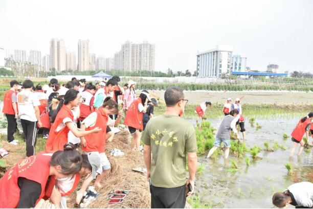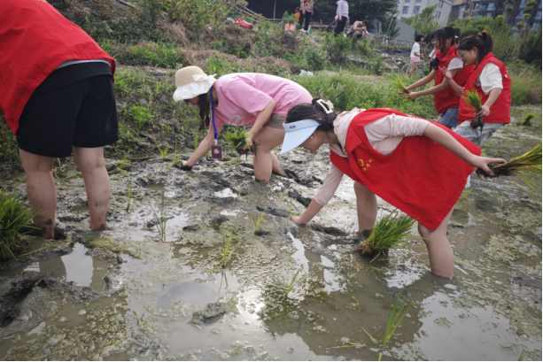 志愿者们全神贯注、充满热情地投入到插秧活动之中,有序按照社区负责人给出的“3443”标准开展活动,同时相互交流技巧,相互鼓励。志愿者们弯着腰,左手分秧,右手插秧,一株株秧苗在他们的手中稳稳地插进泥土里,很快便完成了大半部分水田的种植,呈现出一派生机勃勃的景象。