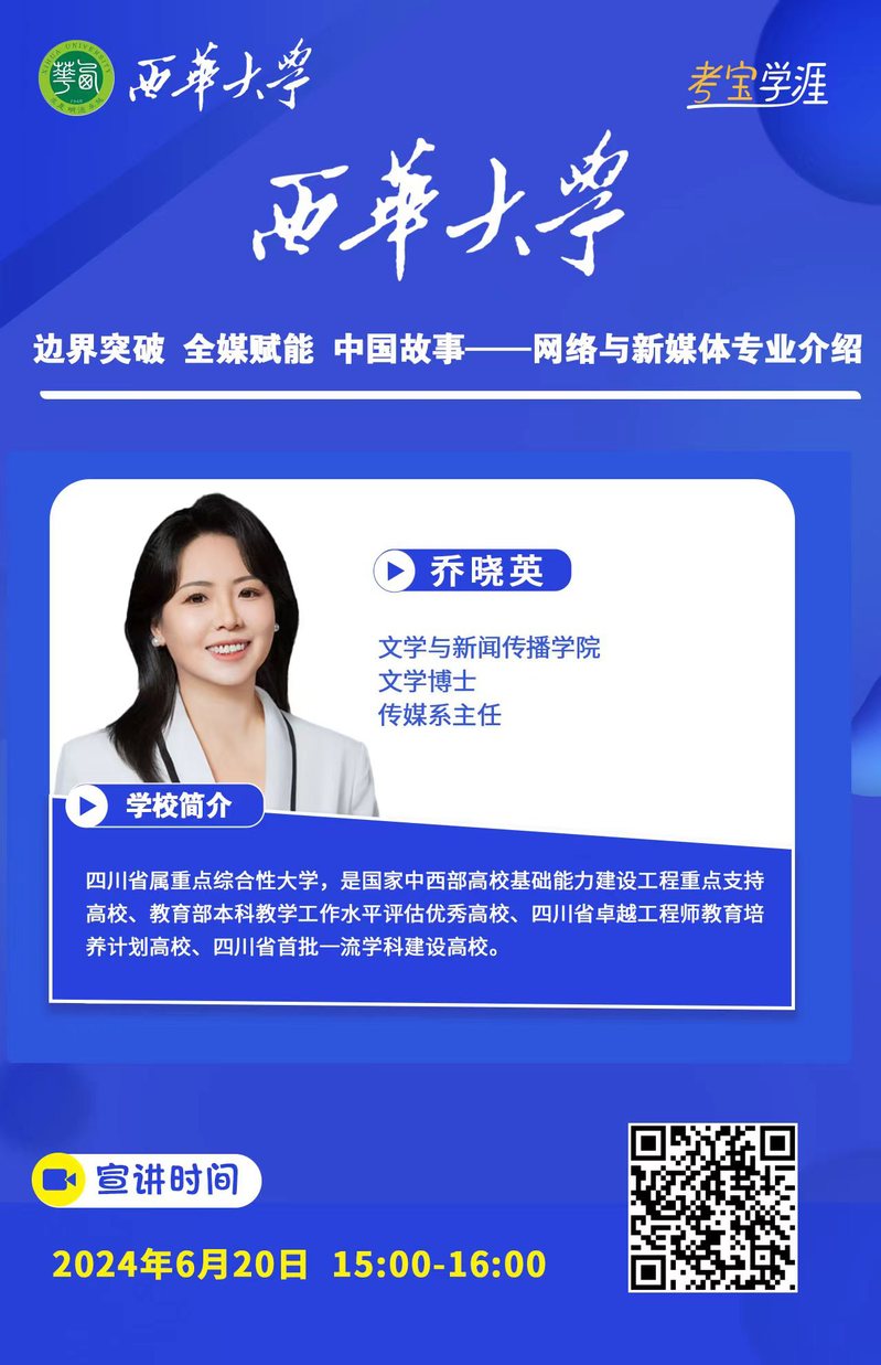 边界突破 全媒赋能 中国故事-----网络与新闻媒体专业介绍即将开始,如需要了解,请自行扫码登录,支持直播回放。