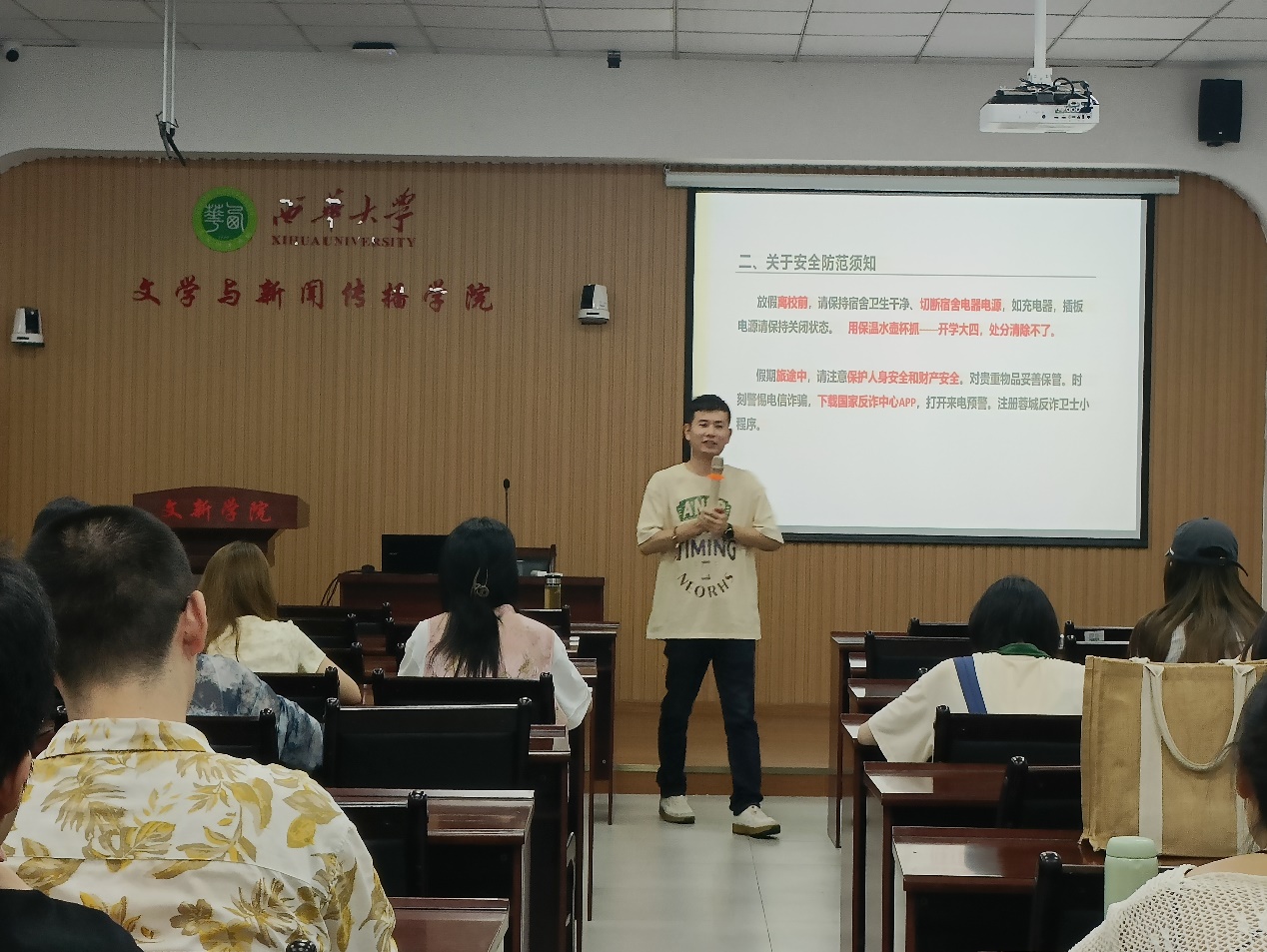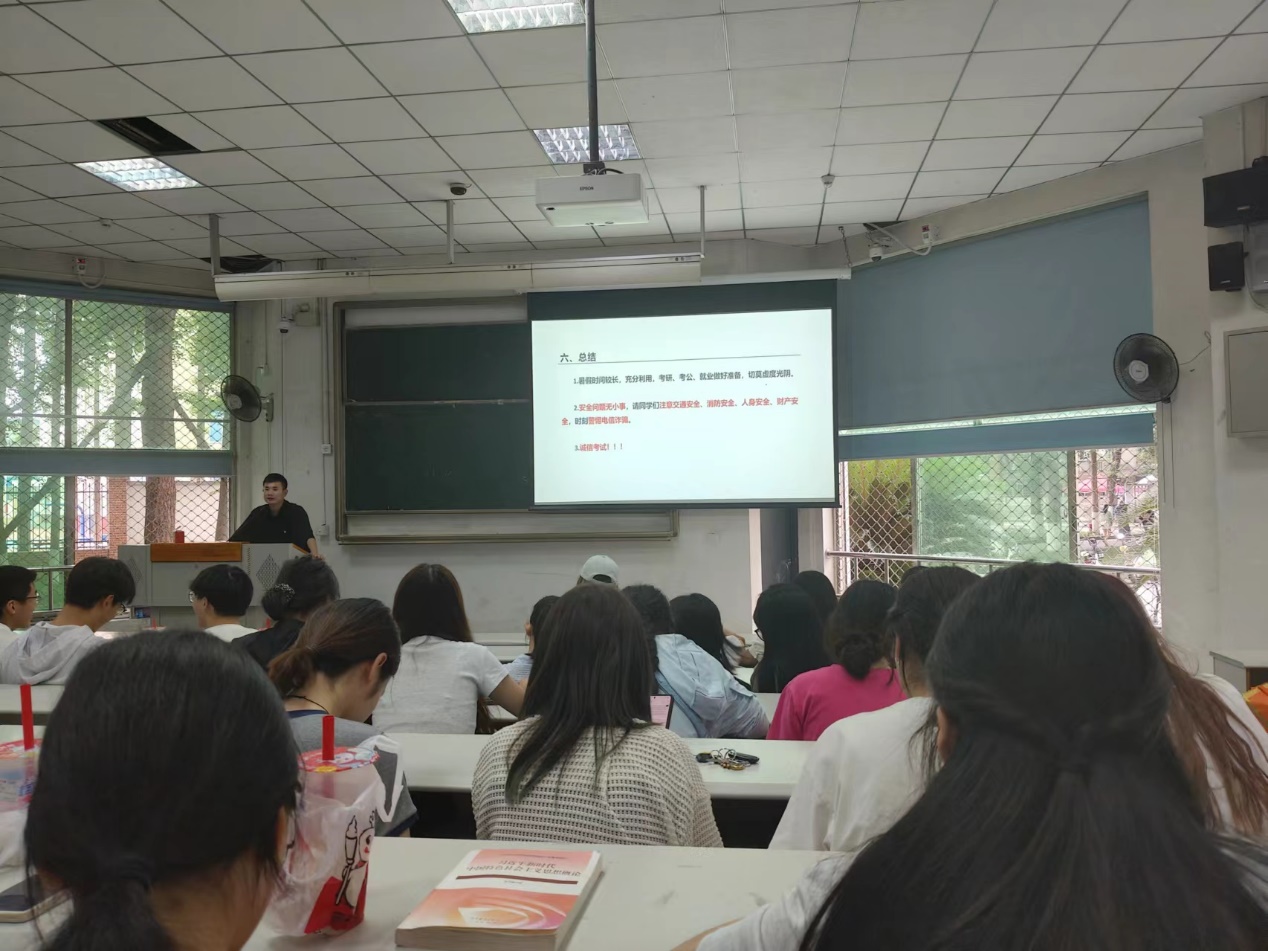 为了给本学期的校园生活画上圆满的句号,同时为即将到来的新学期做好充分的准备,2024年6月27日、28日中午,学院辅导员任焦阳分别在第四、第六教学楼组织召开暑期假日主题班会。学院2021级汉语言文学、汉语国际教育、网络与新媒体、2023级汉语言文学1班同学分别参会。