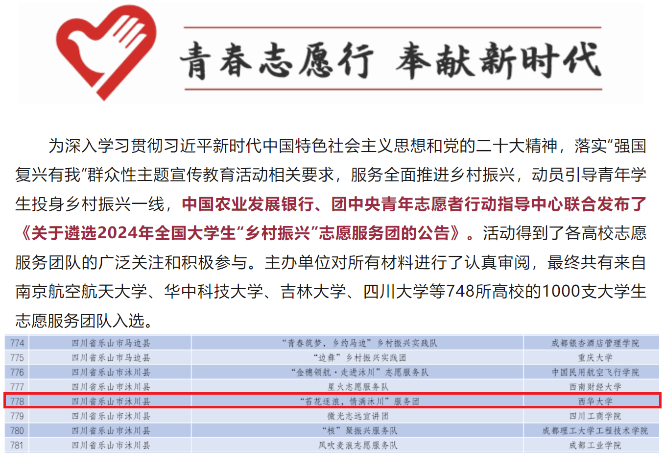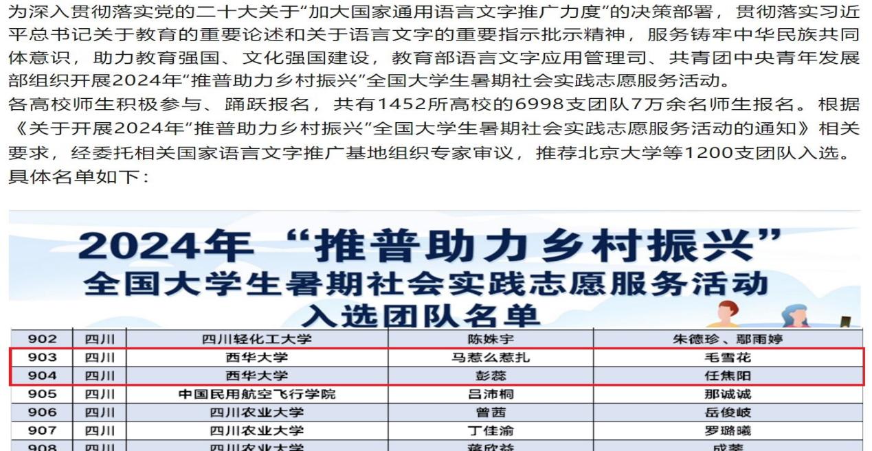 2024年7月,由教育部语言文字应用管理司、共青团中央青年发展部组织开展的“推普助力乡村振兴”全国大学生暑期社会实践志愿服务活动和由中国农业发展银行、团中央青年志愿者行动指导中心联合发布的《关于遴选2024年全国大学生“乡村振兴”志愿服务团的公告》活动审议选拔工作圆满落下帷幕,我院“心沐川泽,赓续文脉实践团”“梦鹰实践团”“乡音筑梦实践团”三支队伍成功从全国众多实践团队中脱颖而出。