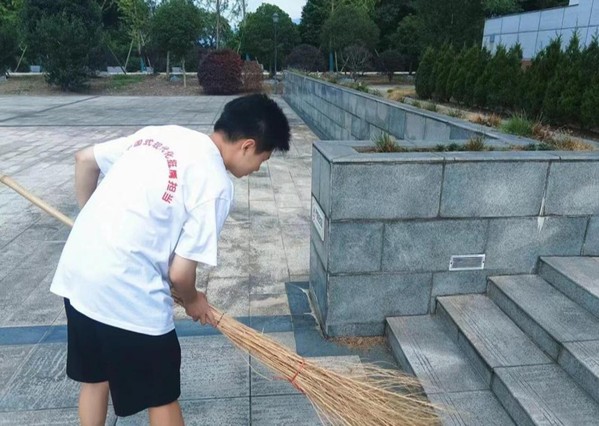 成员在广场打扫卫生 胡诗涵拍摄