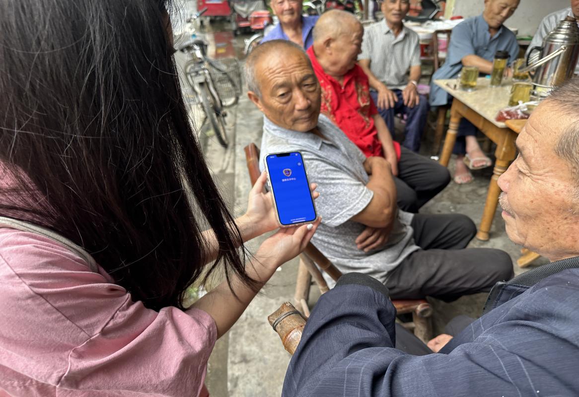 志愿者向老人展示反诈APP 彭怡欣供图