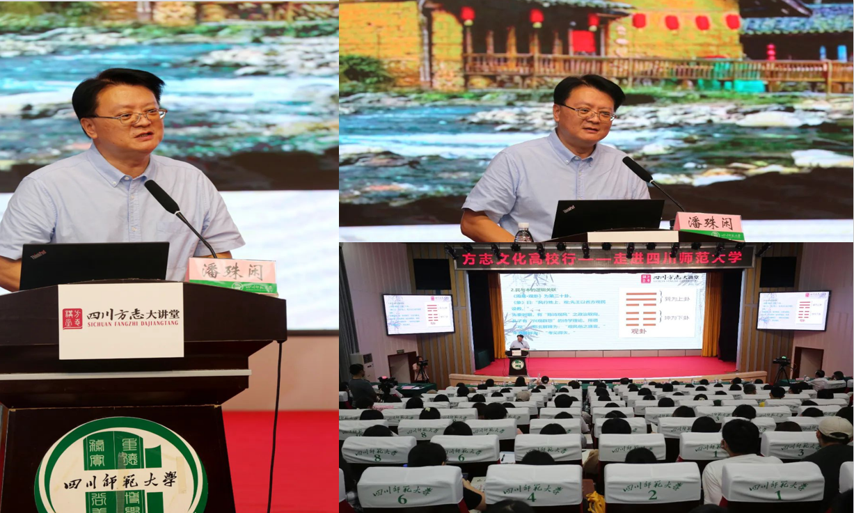 为深入学习贯彻习近平文化思想,加强中华优秀传统文化宣传弘扬,9月29日下午,四川方志大讲堂·方志文化高校行2024年下半年首场宣讲在四川师范大学(狮子山校区)学术厅举行。本次宣讲由四川省地方志办主办,四川省方志馆四川师范大学分馆、四川师范大学图书馆、三苏研究院承办。学院院长潘殊闲出席会议并作宣讲。