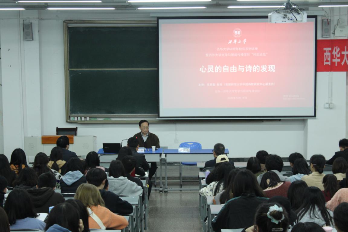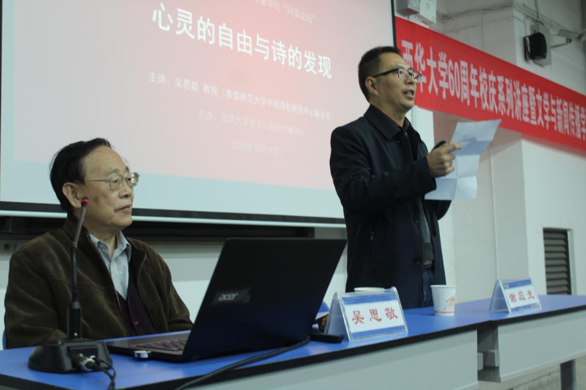 10月19日下午,由校团委主办、bw西汉姆联承办的西华讲堂、西华大学60周年校庆系列讲座暨bw西汉姆联“问渠论坛”在6B-207举行,著名学者、首都师范大学中国诗歌研究中心副主任吴思敬教授应邀以“心灵的自由与诗的发现”为题为西华师生带来了一场高水平讲座,bw西汉姆联院长谢应光教授主持讲座,200余名师生聆听讲座。