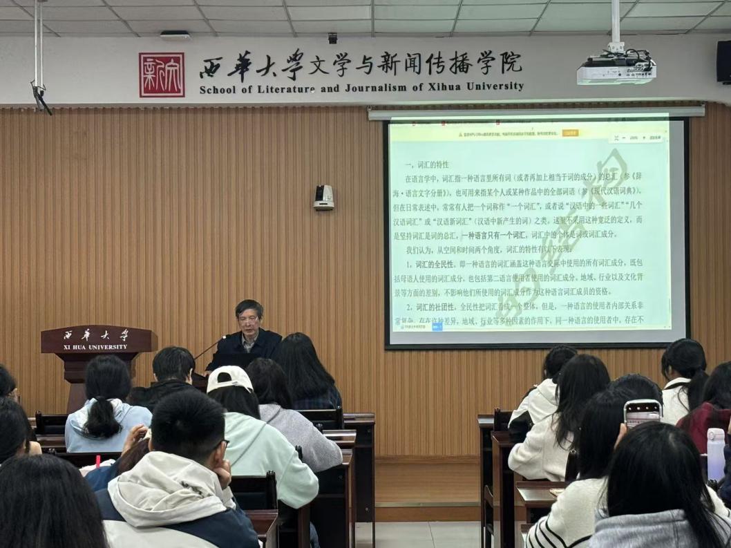讲座伊始,俞理明教授首先提出了关于“词汇的特性”的思考,进而引出“词汇的一般定义和语言学中的词汇定义”这一话题。随后从空间和时间两个角度分析了词汇的全民性、社团性、动态性、共时性等特性。接着探讨词汇成分的差异主要体现在普遍性和稳定性两个方面,俞理明教授把词汇分成了基本层、常用层、局域层、边缘层四个方面,并通过图表展示、具体事例等方式,清楚明白地展示了四方面的划分标准。最后,俞教授介绍了“四分词汇观”用于宏观的词汇分析、核心词表和词汇常用层方面的知识。