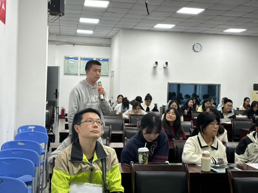 在互动环节,学生与俞教授探讨了“网络热词对词汇原义的消极作用是否大于积极作用”这一问题,俞教授认为网络热词合乎词汇发展的基本规则,应该辩证看待其积极作用和消极作用。