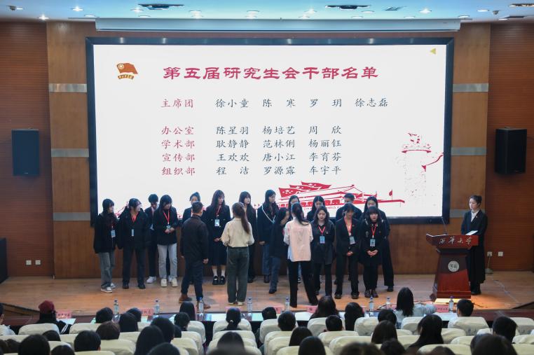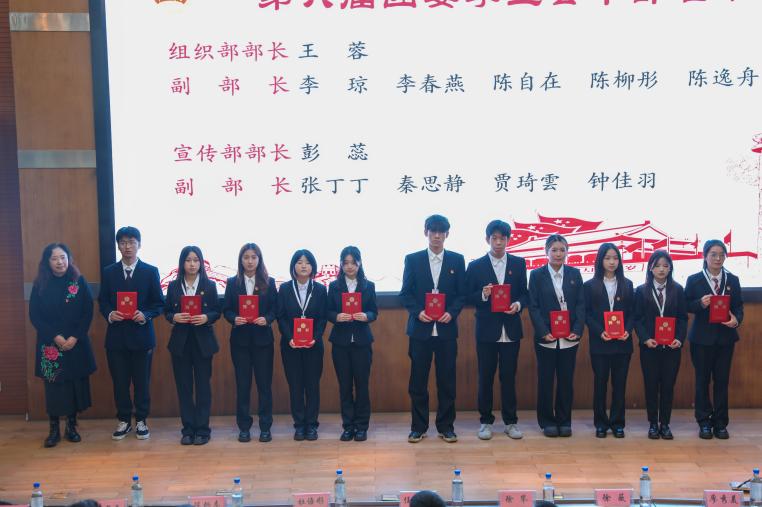 学院党委副书记徐攀宣读2024-2025学年度新任学生干部名单,第五届研究生会干部和第六届团委学生会主席团、干部及其各部门干部举行受聘仪式。各部门部长为干事佩戴工作牌。