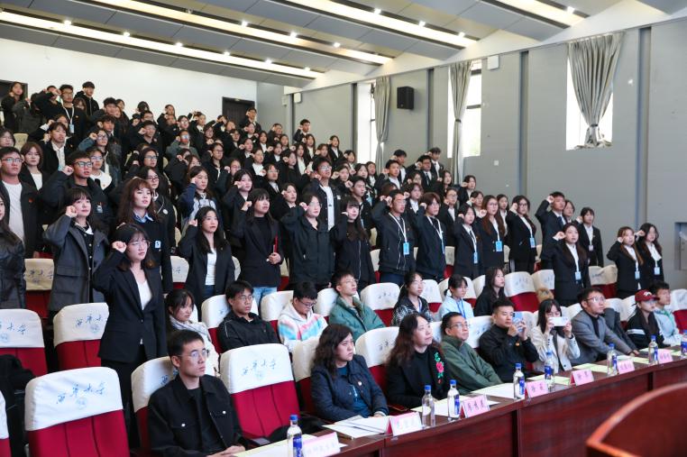 紧接着,第六届团委学生会主席团成员谢文娜带领全体团学成员宣誓。誓言铿锵,会场回荡,全体文新团学人在誓词的引领下整装待发。