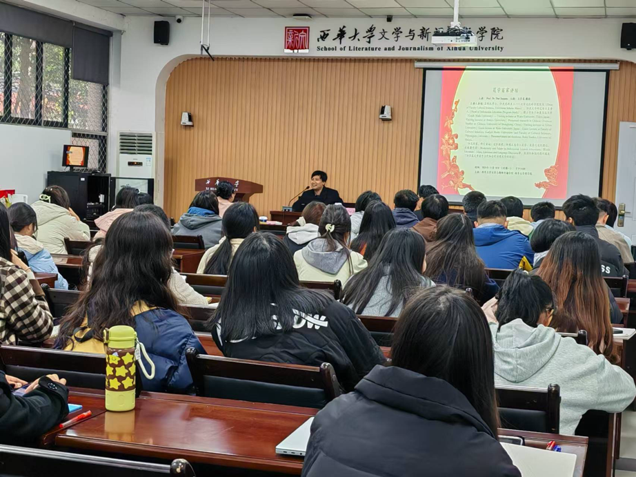 王学东副院长代表学校及我院师生对苏珊托教授表示热烈欢迎和诚挚感谢,并对与会人员提出希望:在今后的学习中,要保持开放心态,博采众长,广泛交流,在文学创作和学术研究中培养宏大视野和国际视野。