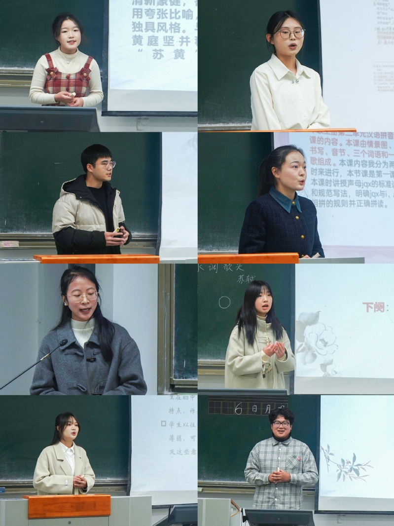 经过讲课比赛初赛的激烈竞争,最终前18名选手入围决赛,有8名选手来到了决赛现场。活动伊始,主持人对本次比赛的目的和规则做了简要阐述。本次比赛旨在为学生提供一个展示教学风采的平台,选手们有3分钟说课时间和12分钟试讲时间,讲课结束后,由评委老师进行提问、打分。比赛过程中,每一位参赛选手都展示出了自己最好的风采,陈传福选手通过绘声绘色的语言向我们展示了会意字的魅力;曾礼琴选手在一片风雨声中徐徐讲述了《定风波》中的苏轼;安佳佳选手通过富有感情的朗读把我们带进承天寺夜游的晚上,结合苏轼的境遇表达了“人生如逆旅,我亦是行人”的人生道理。