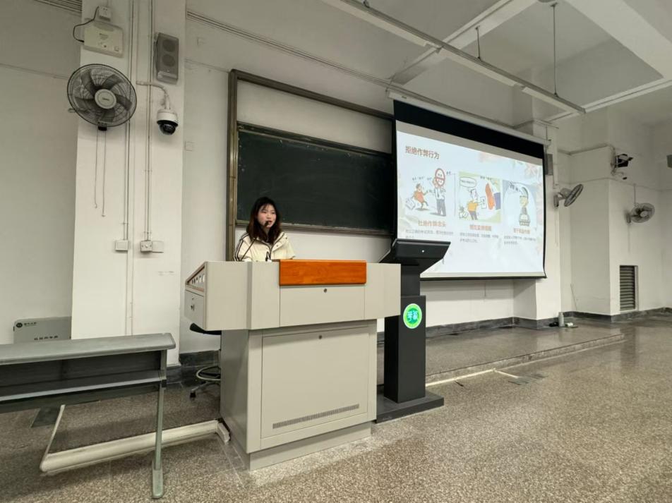 活动中,主讲人罗蓉详细阐述了诚信对于学生成长和学术发展的重要性。她指出,考试不仅是对知识掌握程度的检验,更是对个人品德与诚信的考验。诚信考试是对自己学习成果的真实反映,也是对学术规范的尊重与维护。通过剖析以往考试中出现的作弊案例及其后果,她指出作弊行为对个人学业、未来发展以及学校声誉所造成的严重负面影响,让同学们深刻认识到诚信应考的严肃性和必要性。