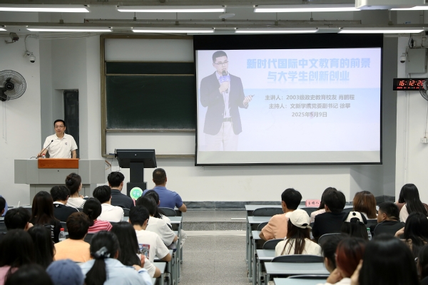 5月9日下午,学院“文新校友开讲啦”第二讲于郫都校区6B-104教室圆满开展。本次讲座主题为“新时代国际中文教育的前景与大学生创新创业”,特邀深圳市章鱼时代科技发展有限公司创始人、CEO,我校2003级政史教育专业优秀校友肖鹏程担任主讲人。讲座由学院党委副书记徐攀主持,学院领导班子成员、中文系汉语国际教育专业教师代表、汉语国际教育专业本科生及其他专业学生代表、学院团委学生会干部参会。