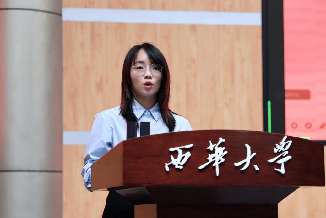 优秀学生代表依次上台发言,分享了他们的成长经验与未来规划。林晓畅、严明、林雨晰、邱母阿散莫、路梦晗六位优秀的同学分别从各自的成长经历出发,讲述了拼搏奋斗的故事,分享了自己的学习感悟。林晓畅回忆起初入西华时的迷茫,坦言是学院丰富的学术讲座与开放式课堂,让她逐渐找到了文学研究的方向。黄湘雨以自身参与融媒体实训项目的经历为例,讲述了学校实践平台对个人成长的赋能。六位优秀学生代表的发言,生动地诠释了西华“求是”校训如何融入学子成长的每一步,赢得现场经久不息的掌声。