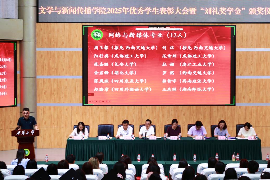 2025523日中午,西华大学bw西汉姆联在四教报告厅隆重举行2025届优秀学生表彰大会暨“刘礼奖学金”颁奖仪式。学院党委书记张雯欣、学院副院长王学东、副院长范佳、学院优秀校友刘礼、中文系主任王燕飞、传媒系主任乔晓英、中文系副主任蒋林欣以及宜宾校区参会的老师出席会议。全体辅导员、获表彰的同学代表、毕业生优秀代表、各年级同学代表参加会议,学院党委副书记徐攀主持会议。