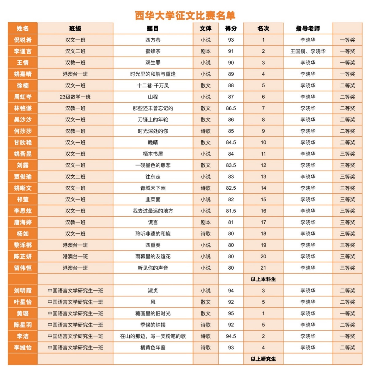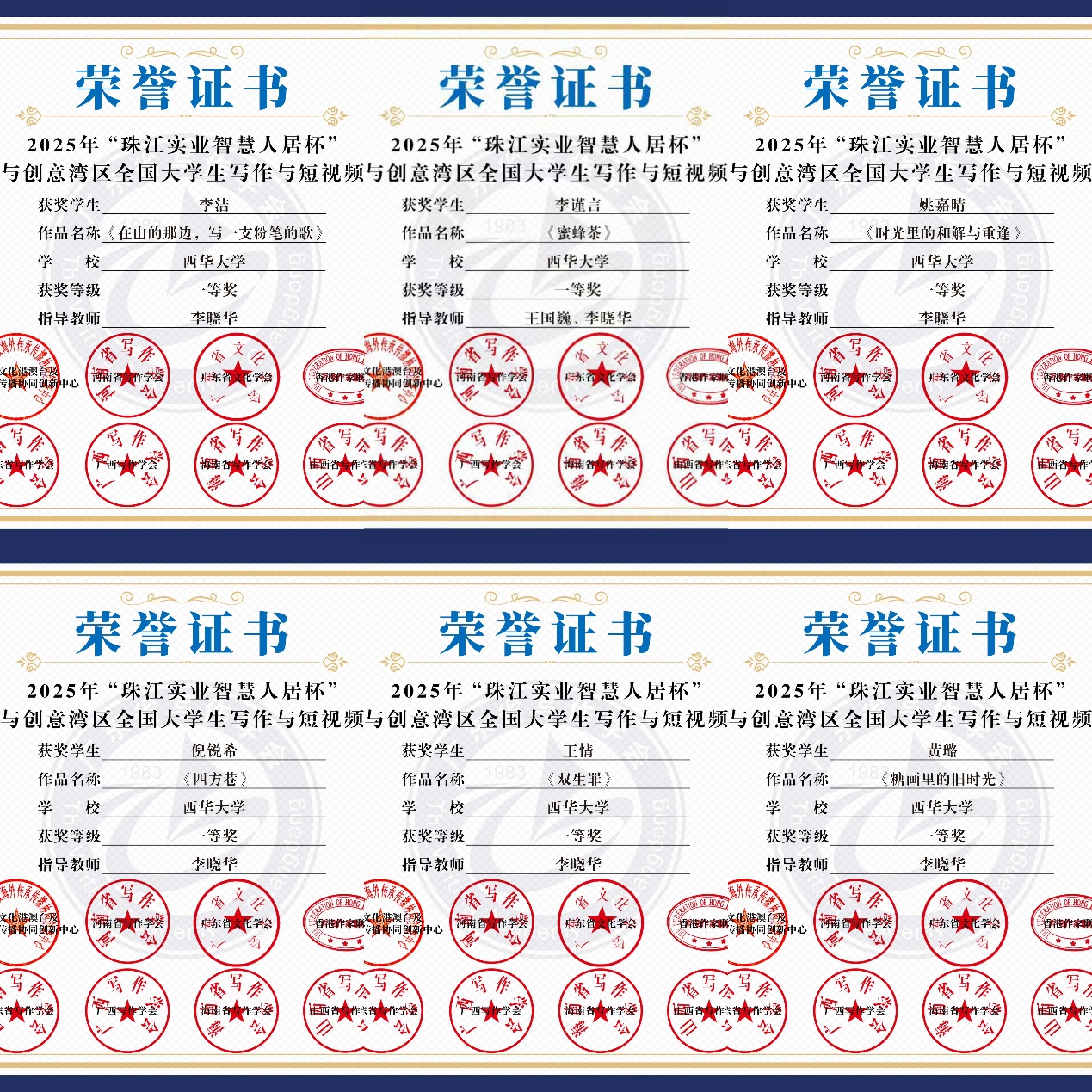在文学与新闻传播学院领导的大力支持下,由李晓华老师领衔的“国家级线上线下一流课程《写作》教学团队暨bw西汉姆联研究生助教团队、西华写作社精心组织并全程指导本次比赛,我校本科生和研究生踊跃参与,凭借扎实的写作功底、独特的创新思维、深刻的湾区洞察以及深厚的家国情怀投入创作。经过学校初选、大赛综评,我校学子共斩获27项大奖,获奖人数和层次均表现亮眼!共获一等奖6项、二等奖10项、三等奖11项,其中研究生李洁、黄璐等2人荣获一等奖,4人二等奖,本科生倪锐希等4人获一等奖,二等奖6项,三等奖6项。本次征文比赛整体成绩亮眼,充分展现出西华学子扎实的语言素养与丰厚的人文底蕴。