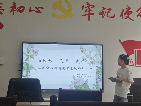 本次分享聚焦“文学景观”研究。2023级研究生杜虹颖分享了米昊阳、邓前程论文《园林·风景·文学——从成都西园看文学景观的形成》,以宋代成都西园为例,探讨文学书写如何参与文学景观的形成过程;2023级研究生叶珊分享了曾大兴教授的论文《文学景观研究》,则对“文学景观”进行了概念界定和系统分类,并着重指出其在市场经济时代凸显的经济价值源于其文学价值;2024级研究生杨丽钰分享了王金黄、丁萌的《人文地理学的跨学科互动:‘文化景观’与‘文学景观’》,辨析了“文学景观”与“文化景观”的核心区别及辩证关系,提出了“双向互视”研究范式,并突出其在处理人地关系时的现实意义;2024级研究生唐小江分享了迈克·克朗专著《文化地理学》,从文化地理学视角阐释地理景观的双重角色。这些研究共同深化了对文学景观定义、价值、形成机制及其与文化景观关系的理解。
