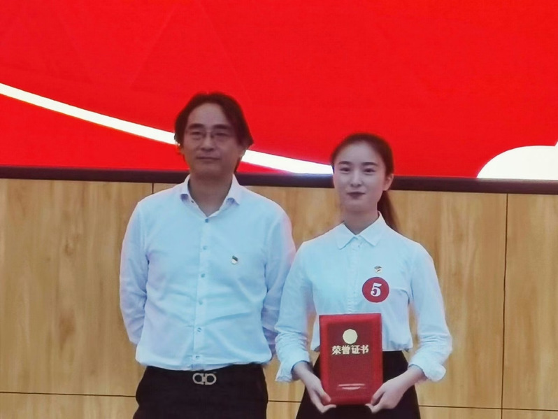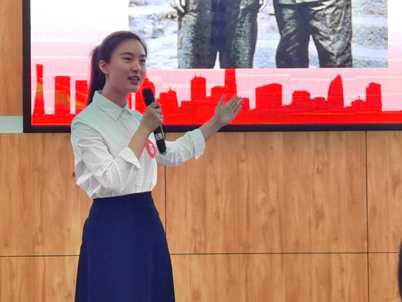 伴随着恢弘的音乐,丁秦围绕中国革命领袖代表周恩来同志的生平、功绩及理想信念等方面展开了题为“一代伟人周恩来”的演讲,她平缓、沉稳而富有感情的讲述感染了在场的评委与观众,最终以综合得分最高分的成绩获得了本次“四史”讲述大赛的一等奖。