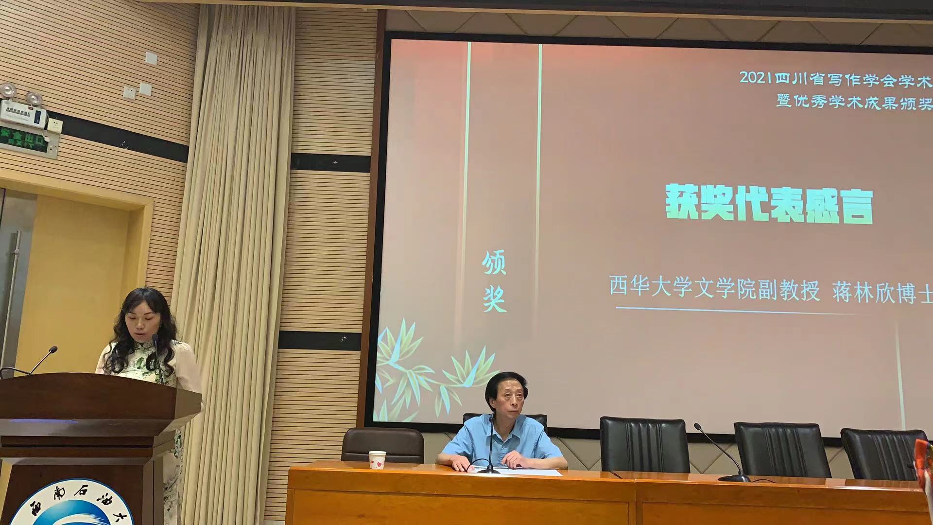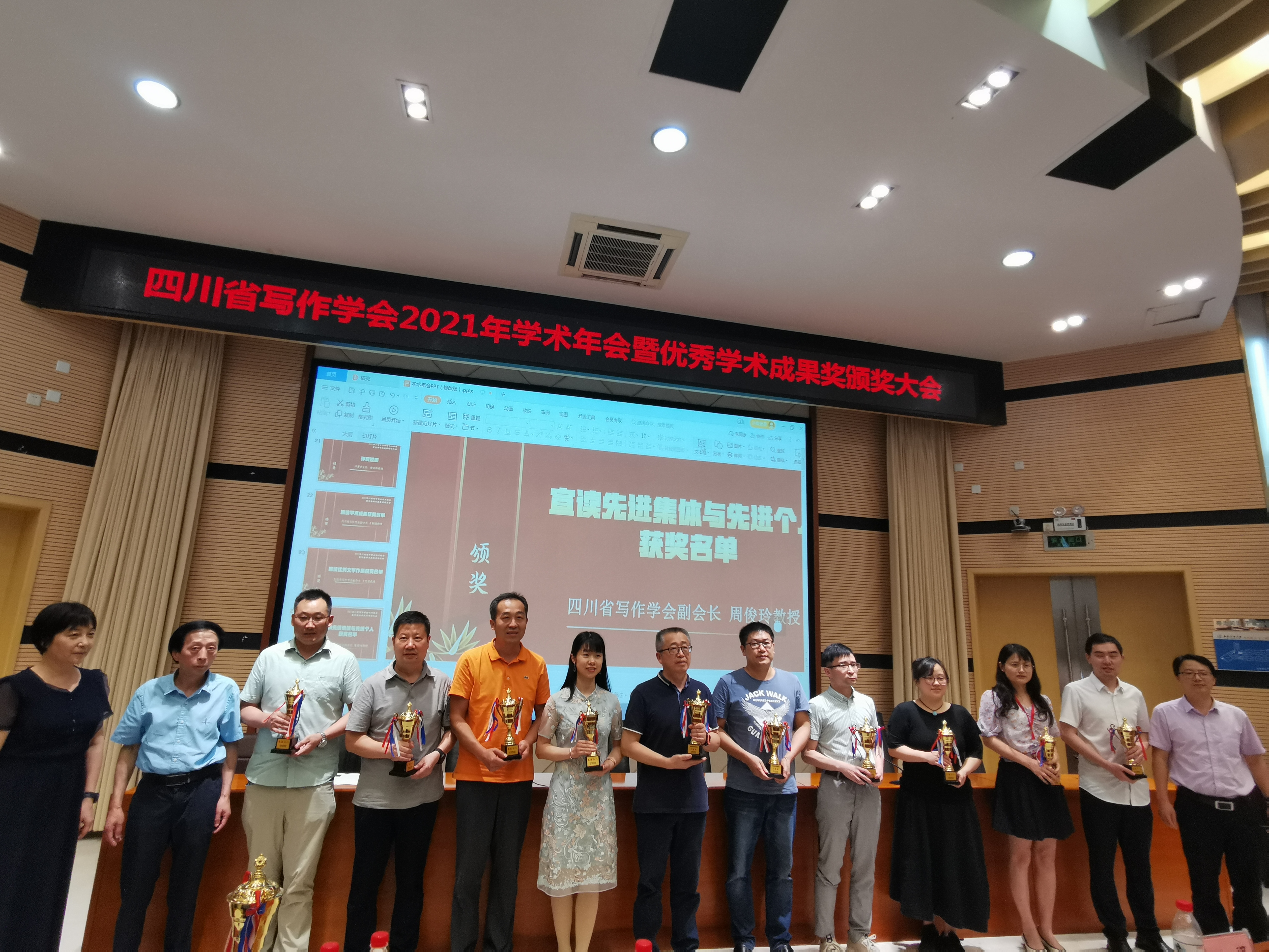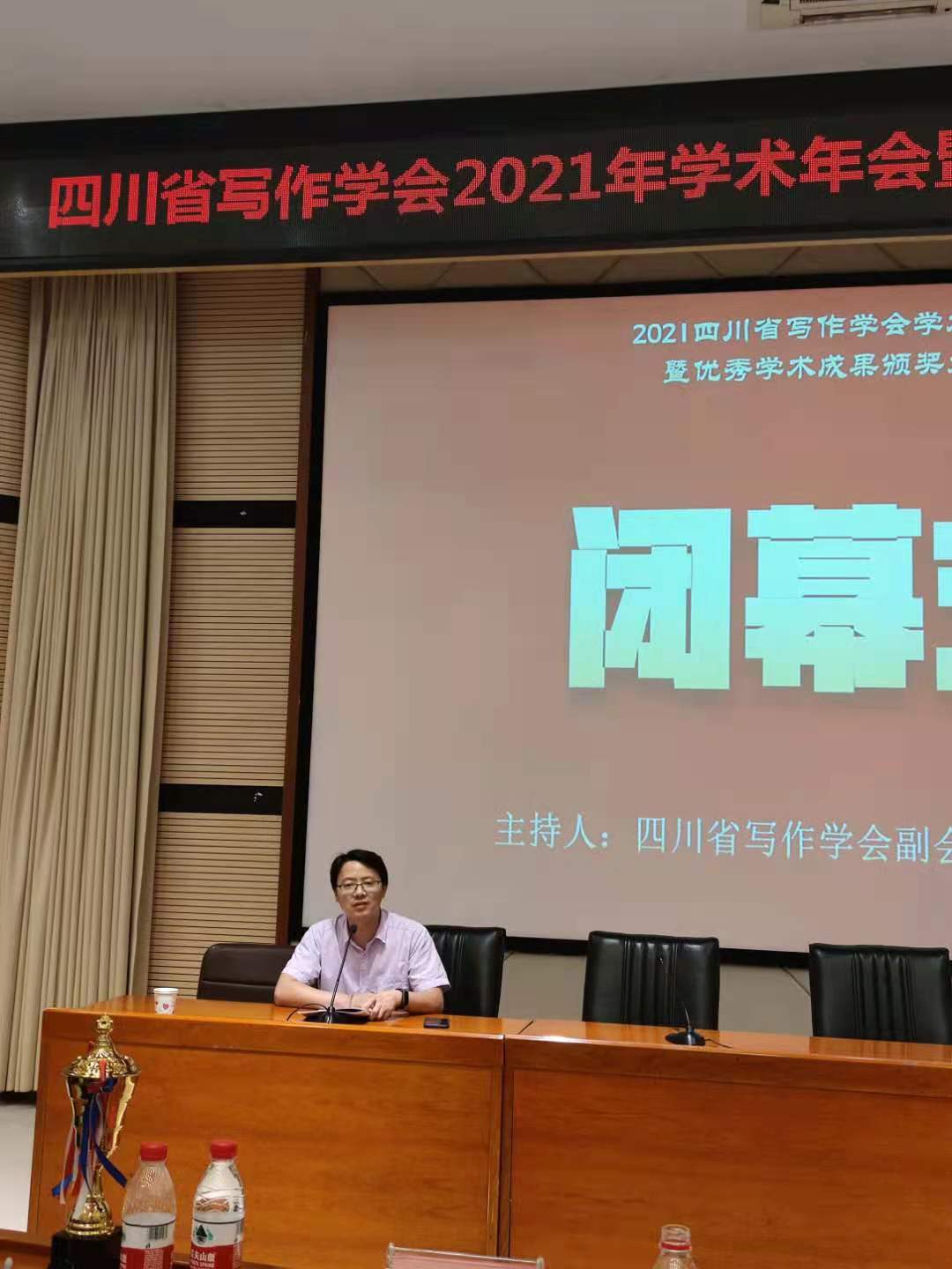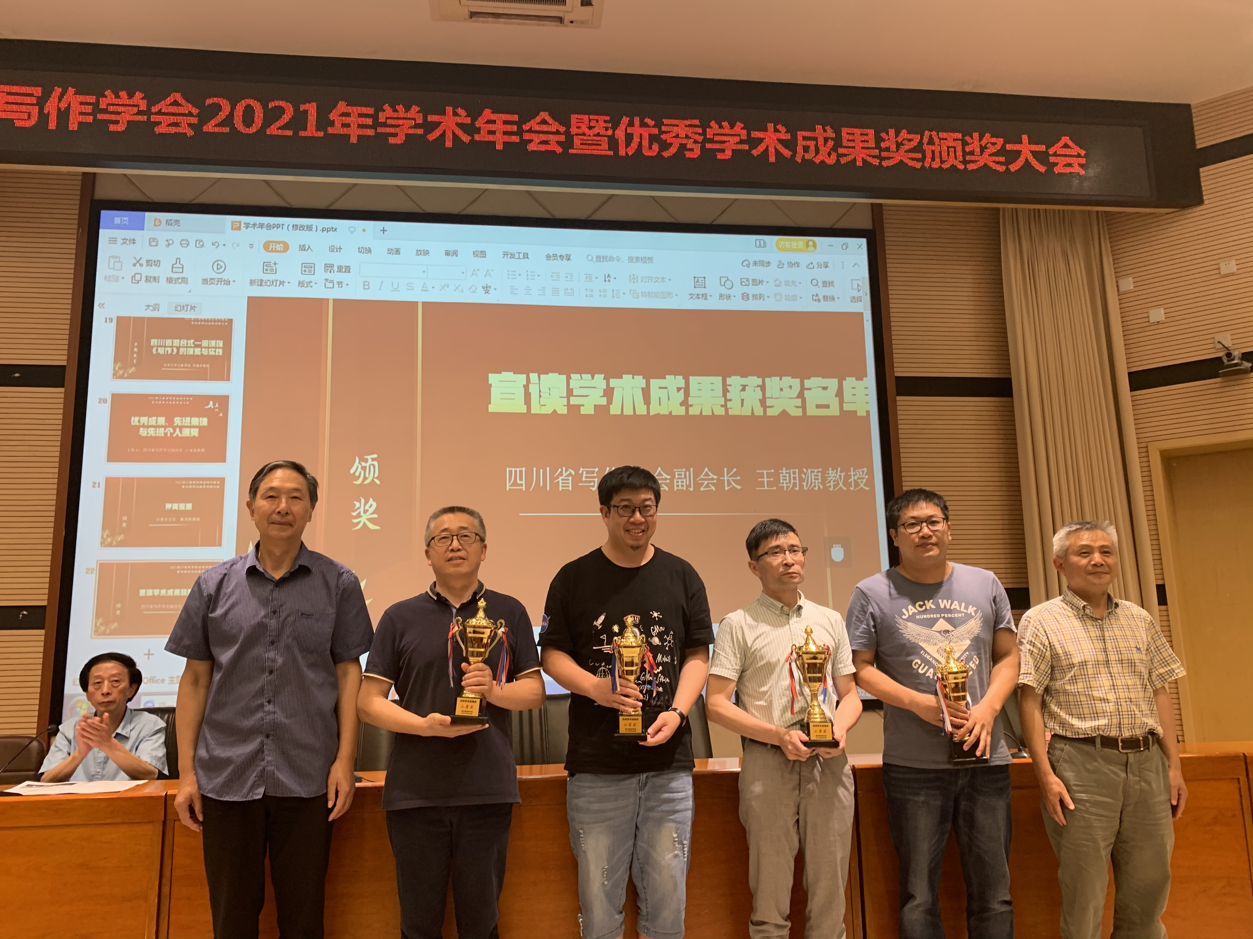 学会对学术优秀成果、文学创作优秀成果的获得者,以及在学会工作、写作教育和科研工作的先进集体和先进个人进行了表彰。我院获得多项集体荣誉和个人奖励,是本次年会收获最丰的参会单位。在集体荣誉方面,继2019年年会获奖后,我院第二次获得写作教研先进集体奖。蒋林欣老师教育部结项成果、专著《中国河流文学研究》获得学术成果奖一等奖。王万洪老师省社科联结题成果、专著《<文心雕龙>文学思想渊源论》获得学术成果奖二等奖。王万洪老师被评为“写作教学与研究先进个人”。另外,经四川省写作学会会长干天全教授提名、全体参会常务理事表决通过,王万洪老师新增为学会常务理事。有关领导向获奖者颁发了奖杯、证书。我院蒋林欣副教授代表获奖者发表感言。王学东教授作为学会副会长主持年会闭幕式,并为多名获奖教师颁奖。
