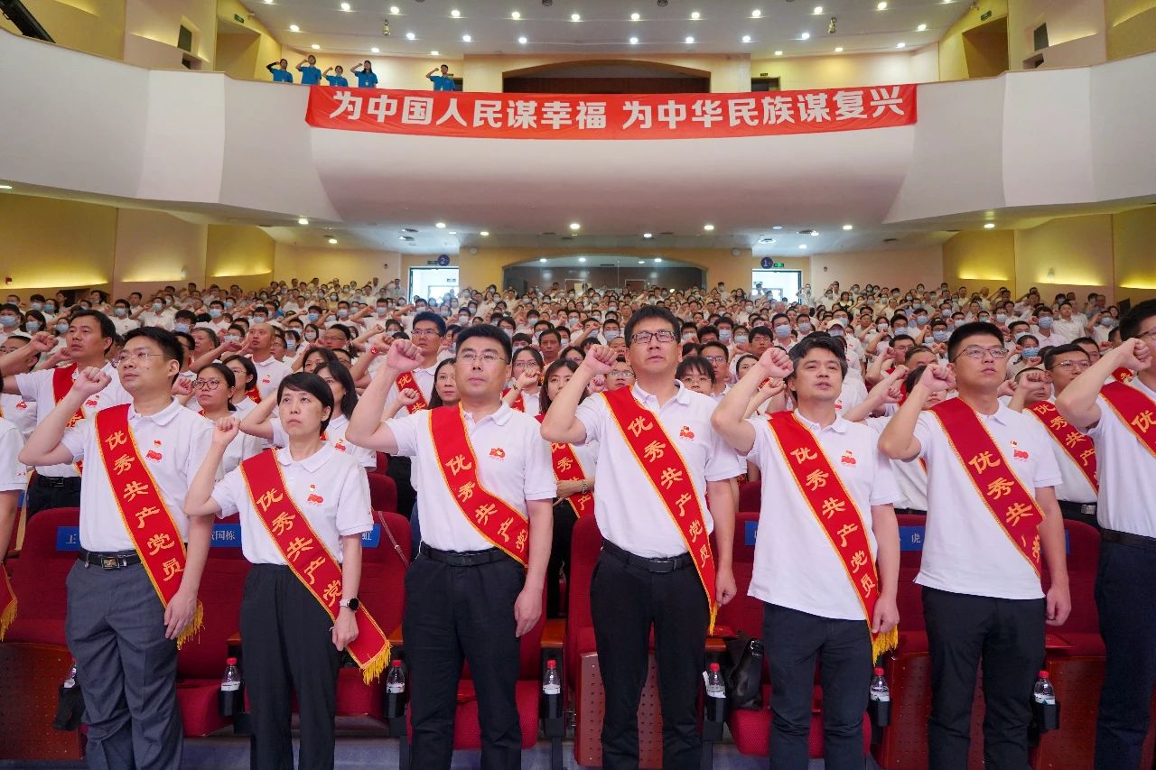 表彰大会上还举行了预备党员代表入党宣誓、参会全体党员重温入党誓词仪式。全体党员举起右手,在领誓人、学校党委书记余孝其的带领下面向党旗庄严宣誓。庄严的宣誓活动使每一位党员都接受了精神洗礼,更加深切地感受到身为新时代党员的责任和担当。