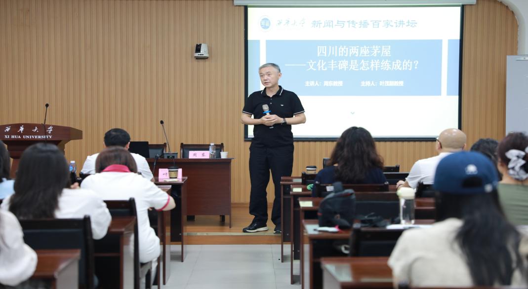 2025年9月24日上午10点,学院邀请东周社创始人、中国广播电视主持人金话筒奖获得者、四川省人民政府文史研究馆特约研究员周东教授开展“四川的两座茅屋——文化丰碑是怎样炼成的?”主题讲座。学院教师代表、各年级本科生与研究生参加。讲座由叶茂副教授主持。