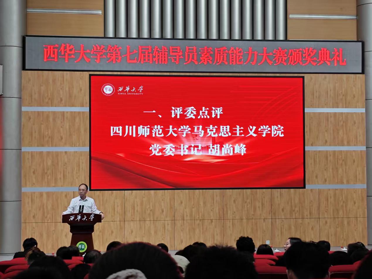 颁奖典礼上,四川师范大学马克思主义学院党委书记胡尚峰高度赞扬了我校学生演员表演生动投入,给辅导员带来挑战的同时也构筑起师生良性互动的基础。同时对比赛中出现的问题提出针对性的意见和建议——辅导员应切实做好学生心理问题疏导工作。例如与学生谈心,他讲到:“倾诉与倾听,换位思考是建立起师生良好沟通的重要方式,辅导员要灵活处理学生心理健康问题,将其统一在一个矛盾体之中,切实解决心理困惑。”与此同时,他着重强调了辅导员要善于提问,引发学生思考,引导学生化解情绪危机,勇敢走出舒适圈。