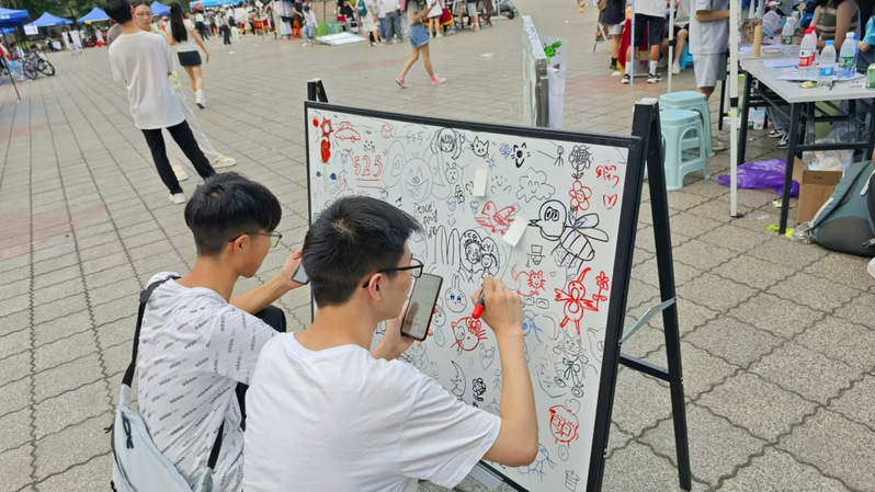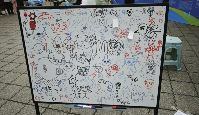 本次活动参加人数超过3000人,活动当天,现场洋溢着欢声笑语,四大特色项目成为了引人注目的焦点。“共画一幅画”环节中,同学们纷纷拿起彩笔,在公共画板上勾勒出心中的世界,色彩斑斓的作品不仅展现了个性与创意,也成为了释放压力、分享快乐的桥梁。“你画我猜”的互动游戏则充分调动了参与者的艺术细胞与逻辑思维,促进了同学间的默契与理解。而“面对面推手”活动在轻松的对抗中,帮助同学们以一种新颖的方式释放了累积的压力,增强了人际交往的乐趣。“漂流瓶”区域更是温情脉脉,同学们在小小的纸条上书写下愿望、祝福,传递着正能量,也收获了来自他人的温暖与鼓励。
