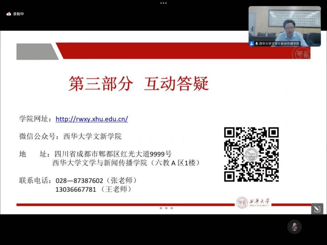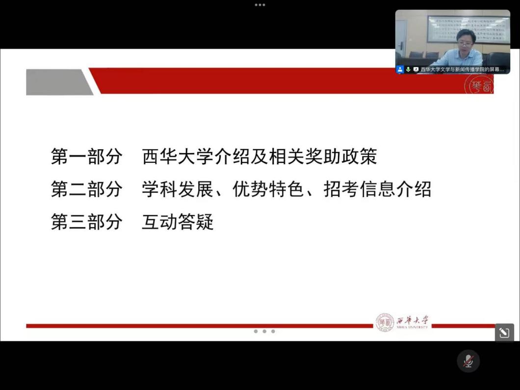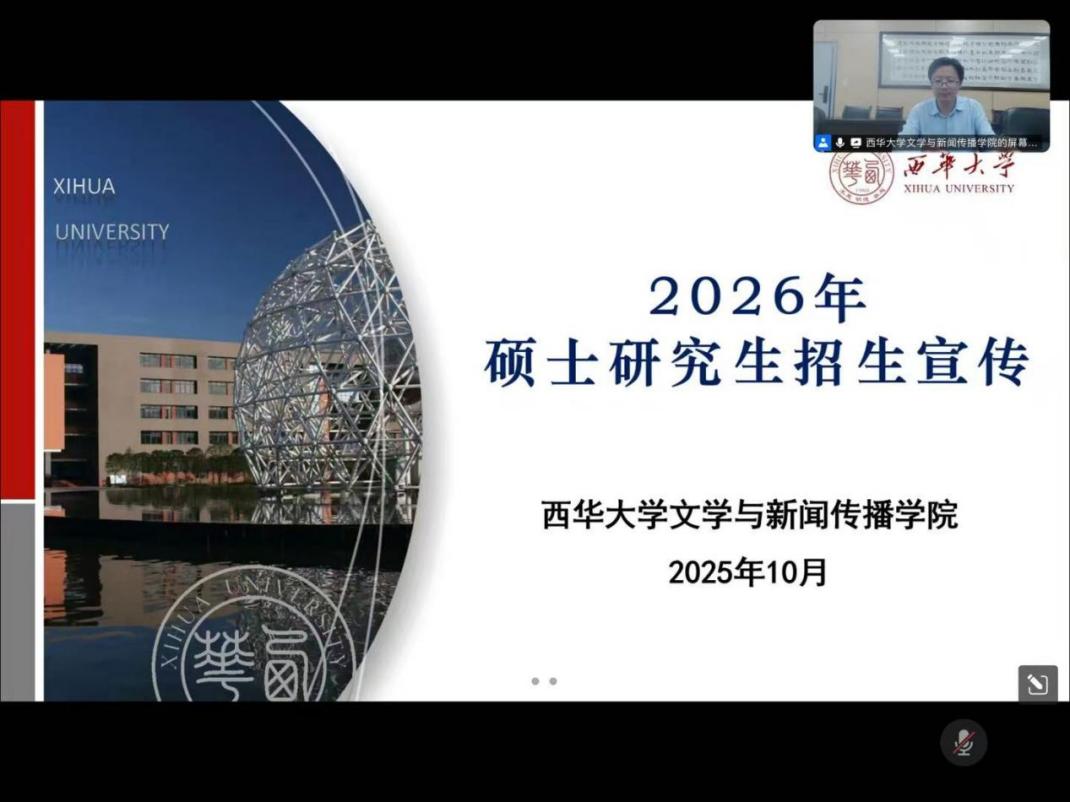 2025年10月15日16时,学院举行2026年研究生招生线上宣讲会。本次宣讲会由学院副院长王学东担任主讲,中国语言文学、新闻与传播、学科教学语文、国际中文教育四个专业的教师代表共同参与,吸引了四川省内多所高校的本科生在线参加。