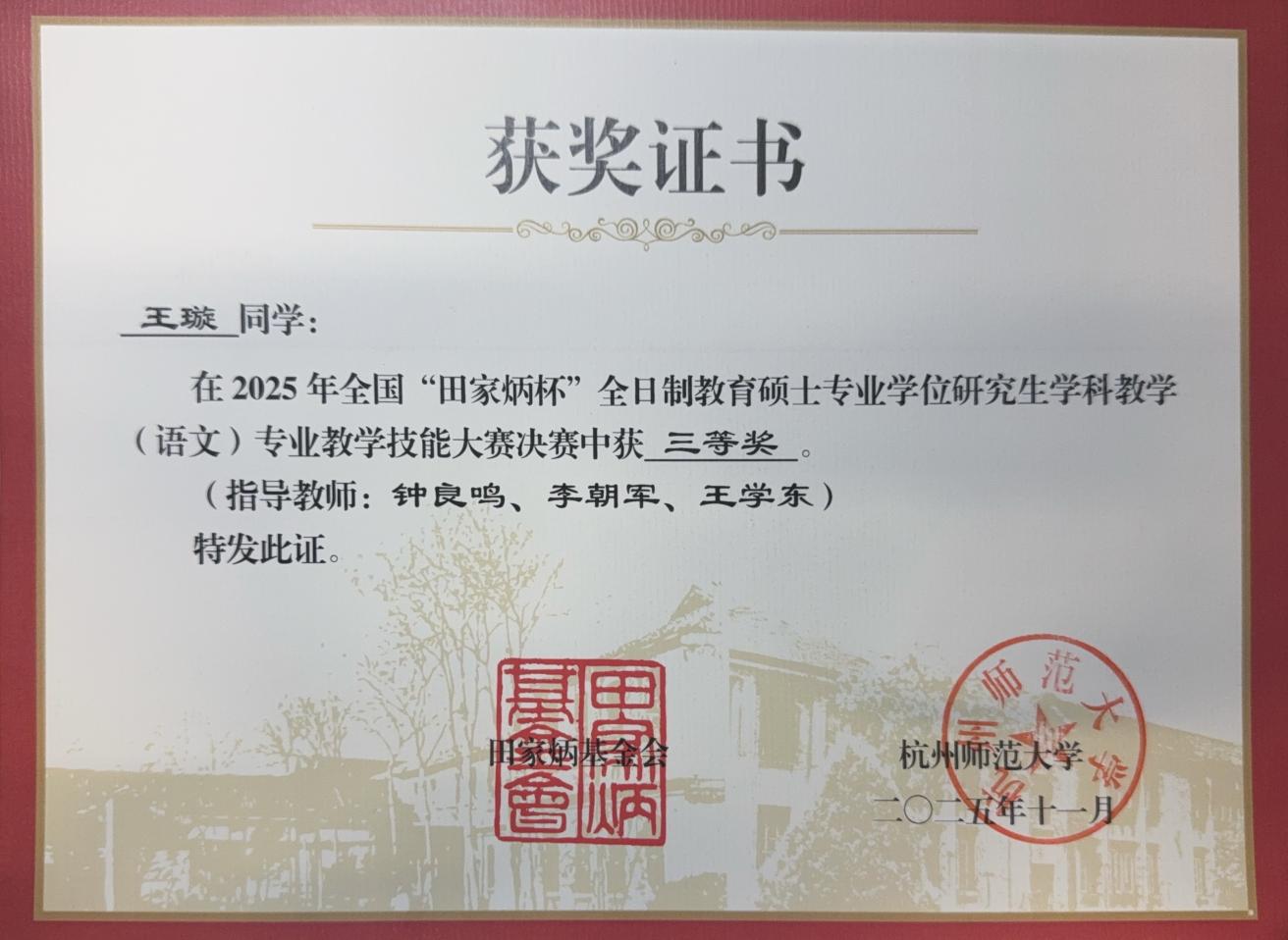 2025年11月7日至9日,全国“田家炳杯”全日制教育硕士专业学位研究生学科教学(语文)专业教学技能大赛决赛在浙江省杭州市杭州师范大学仓前校区圆满落幕。作为国内教育硕士领域层次最高、规模最大的教学技能竞赛之一,本次决赛经初赛专家评审、赛事专家组审议,来自全国128所高校的173名优秀选手以“同课异构”的方式同台竞技,全面展示了新时代全日制教育硕士的教学能力与培养成果。