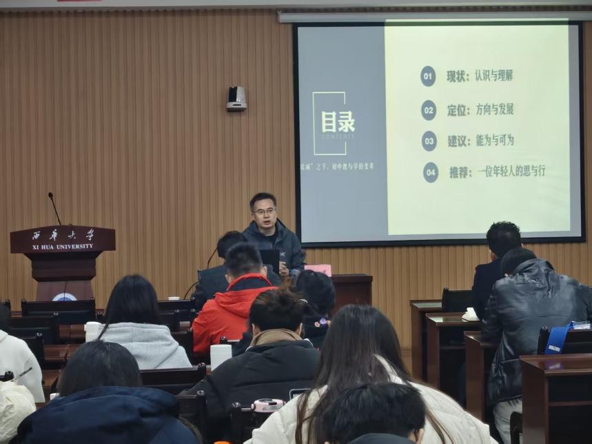 2025年11月18日下午14点,学院邀请成都市教育科学研究院中学语文教研员,中学教育研究所副所长,全国百佳语文教师,四川省教书育人名师,成都市学科带头人黎炳晨教授作《我们期待怎样的语文教师》专题讲座。学院教师代表钟良鸣老师,各年级本科生与研究生参加,讲座由学院副院长王学东教授主持。