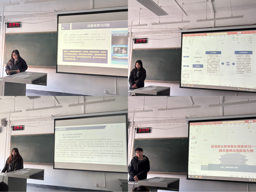 2024级新闻与传播专业研究生唐艾林同学,紧密围绕家暴议题的网络舆论场域,从情感传播的独特视角出发,对相关舆情的生成机制、演化阶段与治理路径进行了深入剖析与系统性研究。马子健同学聚焦于国产动漫粉丝文化中的群体极化现象,以腾讯视频动漫剧场为典型案例,对其成因机制、表现特征及潜在影响进行了深入的传播学分析与批判性审视。