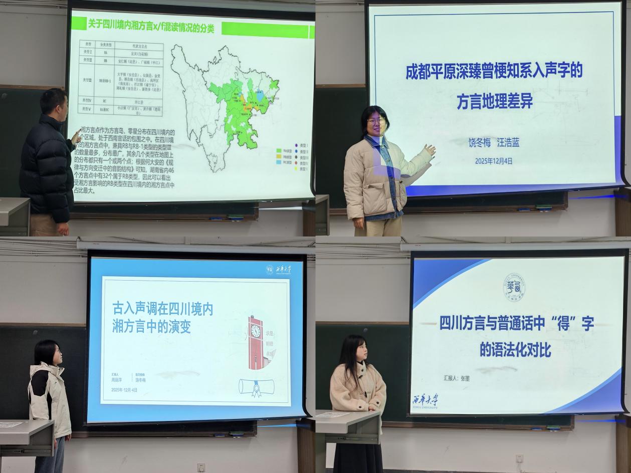 语言学方向四位同学深耕语言本体研究,聚焦方言演变与语法对比,展现了扎实的语言学科素养。周丽萍探析古入声调在四川境内湘方言中的演变规律,为方言演变研究提供实证支撑。汪浩蓝、李云鹏分别围绕成都平原深臻曾梗知系入声字的方言地理差异、四川境内湘方言非晓组字演化展开研究,丰富了方言地理研究的成果。张墨对比四川方言与普通话中 “得” 字的语法化差异,揭示了语言演变的内在机制。饶冬梅老师对同学们的汇报进行高度肯定。