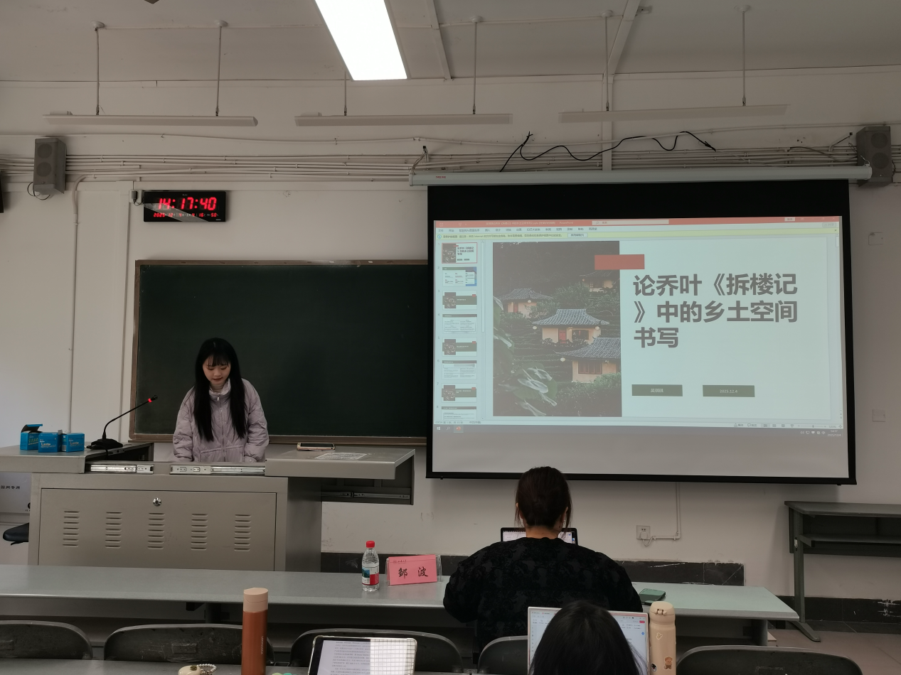 现当代文学方向八位同学聚焦当代文学创作与文学现象,展现了敏锐的文本解读能力与时代洞察力。王一从时空体视角解读白先勇流寓小说的中国性,严敏以《宝水》为例,探析新乡土写作的空间新质。杨培艺、唐娟、范林俐分别围绕杨牧非虚构写作、王计兵诗集、子非花 “新抒情主义” 诗歌展开研究,挖掘当代文学的多元表达。张莉茗探析余秀华诗歌中的色彩意象,解读其情感表达与生命意识。杨丽钰、唐小江则分别聚焦王蒙 “季节系列” 小说的声音叙事、罗伟章《红砖楼》中的恋地情结,展现了对当代长篇小说的深度解读。蒋林欣老师认为同学们的选题细腻准确,但要注意强化问题意识,避免单纯的文本赏析。