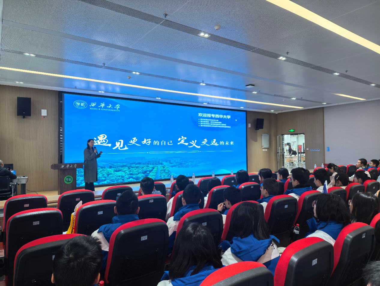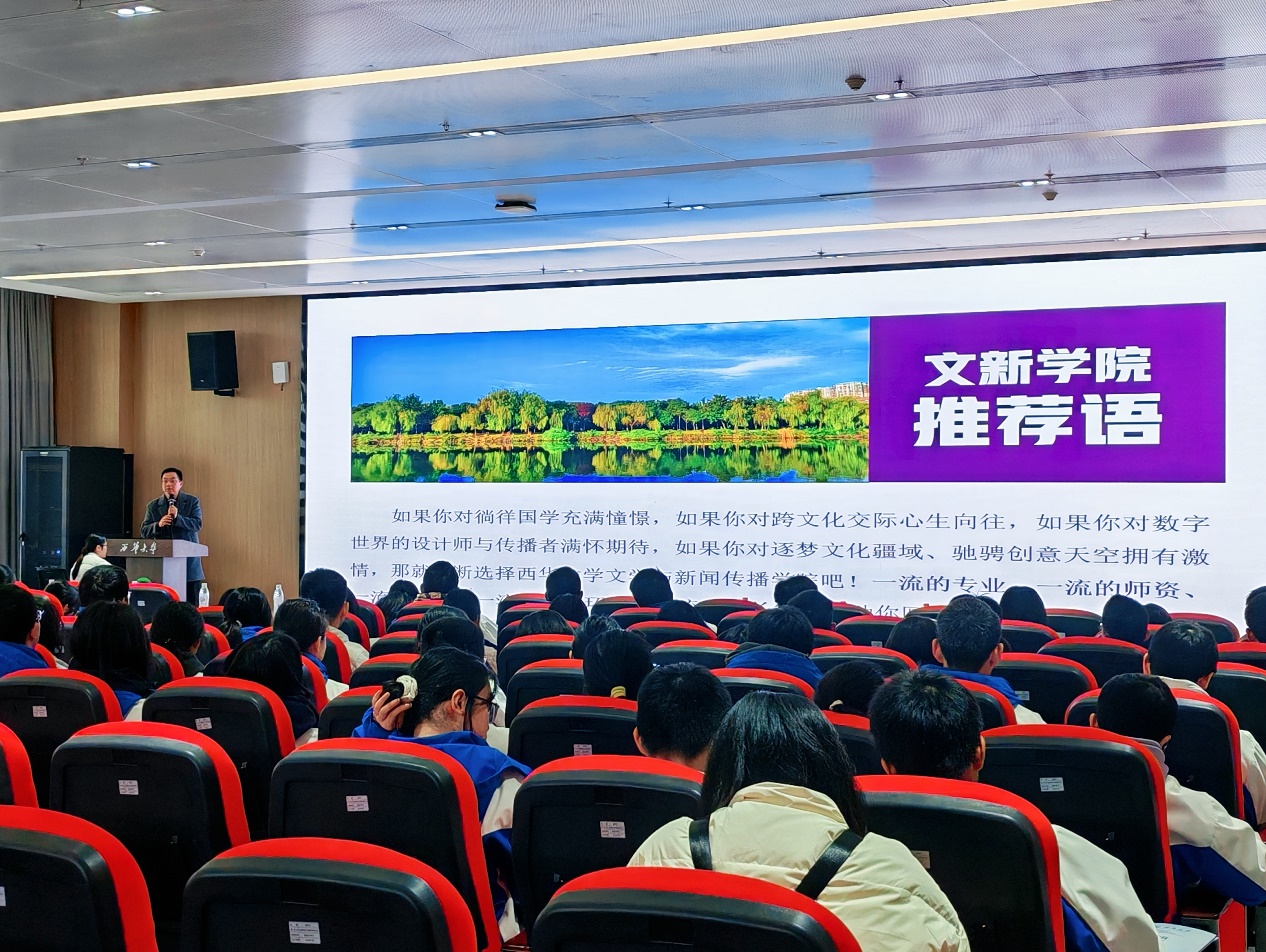 上午十点,研学活动由宣讲会拉开帷幕。学校招生就业处副处长黄潇、文新学院党委副书记徐攀莅临宣讲会现场,分别对西华大学及文新学院作了介绍。