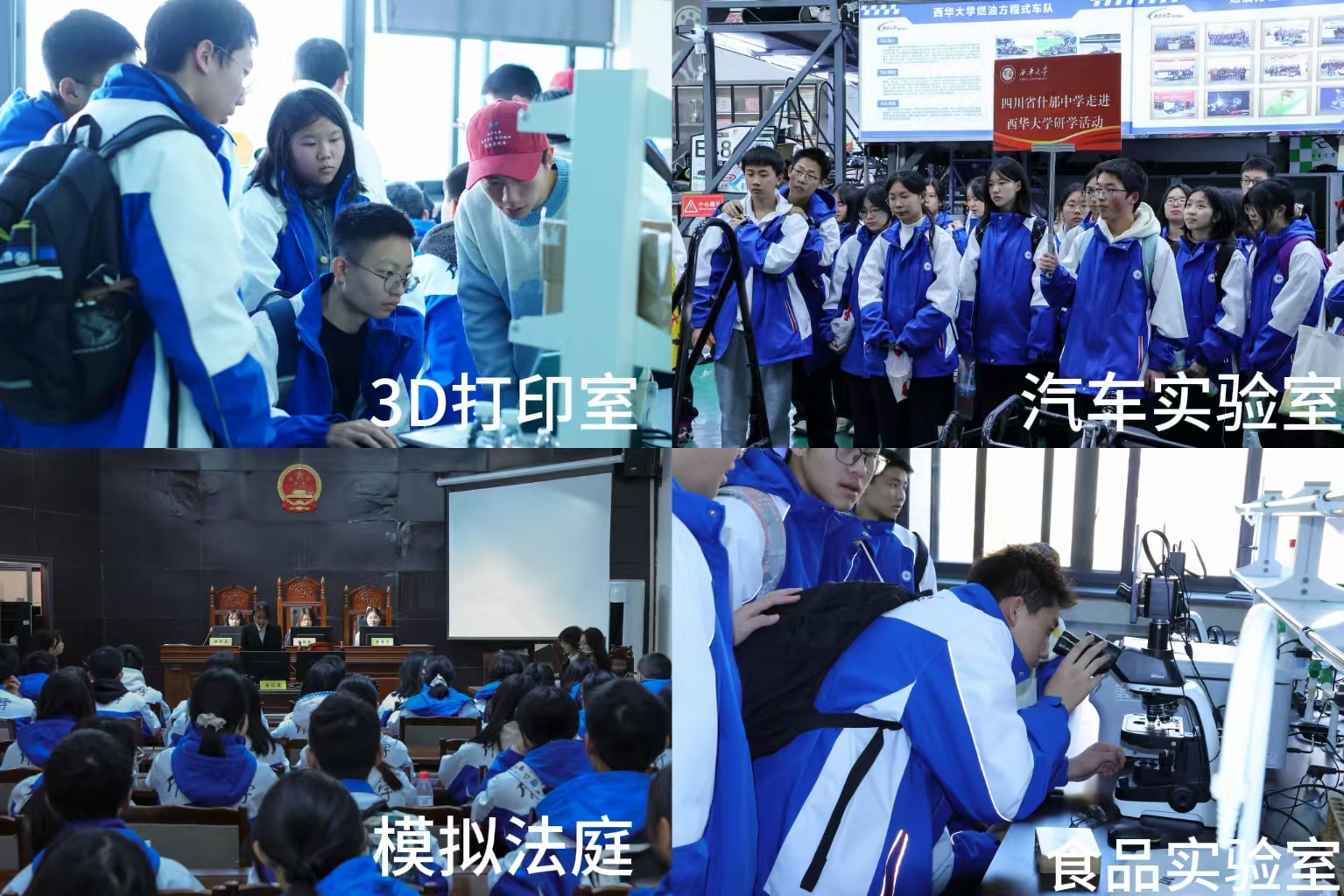下午,什邡中学高中生研学团队在西华大学进行了以科技实践与法治教育为主题的研学活动。在汽车实验室,老师通过视频演示、现场讲解与互动问答的方式,帮助同学们了解汽车实验的基本流程与安全规范;在食品试验室,同学们参观了多个功能实验室,认识了先进的研究设备,并了解到食品科研成果如何转化以应用到社会生产中;在3D打印室,老师介绍了3D打印技术,随后同学们分组进行简易模型的设计实践;模拟法庭活动中,通过模拟庭审流程,同学们切身感受到法律程序的庄严与公正,进一步理解了法治精神与社会责任的内涵。