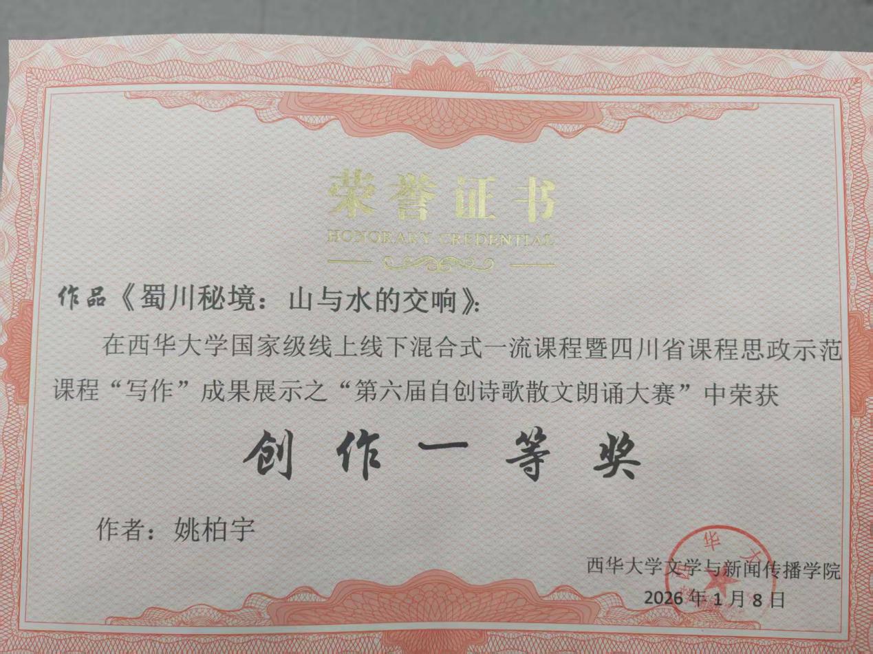 其中,散文《蜀川秘境,山与水的交响》获创作一等奖,诗歌《狗尾巴草》、散文《蜀秋寄豫思》、散文《赴一场潮汕旧梦》获创作二等奖,诗歌《金色的诗》、散文《彝海情》等6个作品获创作三等奖,其余11个作品获优秀奖。